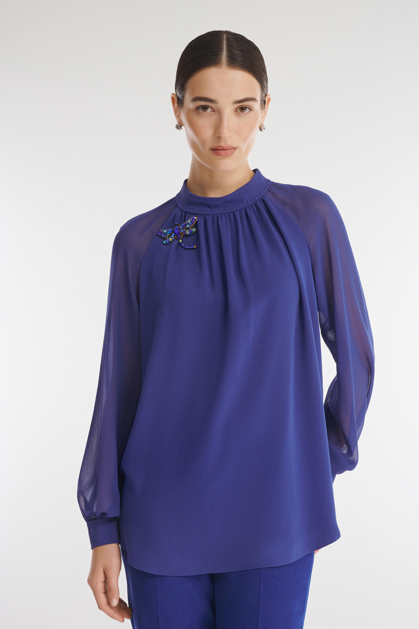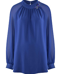 Блузка из воздушной поливискозы. Полупрозрачные рукава-реглан подчеркивают легкость изделия. Дизайн дополнен акцентными пуговицами со стразами. Носите блузку свободной или заправленной на свое усмотрение.