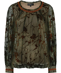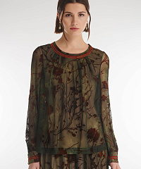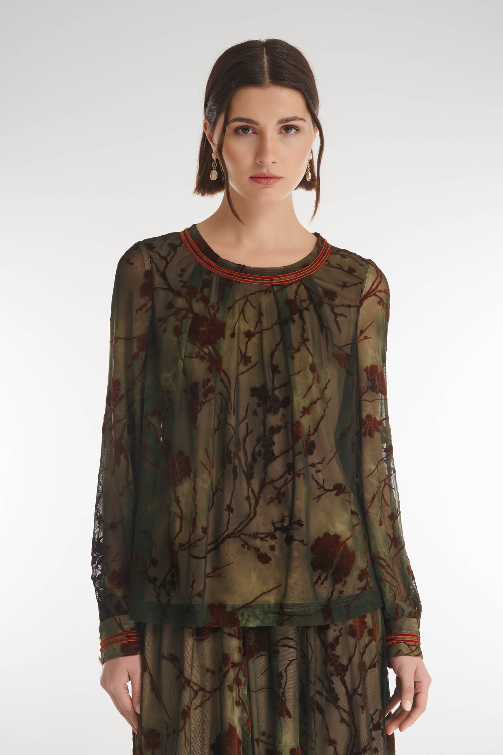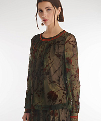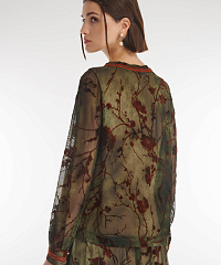 Воздушная и утонченная блузка, где бархатный цветочный узор на эластичном тюле плавно сочетается с мягкой подкладкой лицевой части. Прозрачные рукава придают образу легкость и элегантность, а декоративные складки создают женственный силуэт. Манжеты с акцентными пуговицами и контрастная отделка выреза делают образ завершенным и стильным — идеальный выбор для особого случая или эффектного повседневного образа.