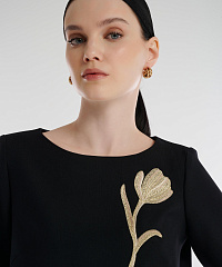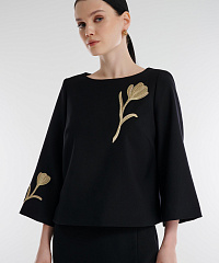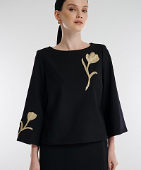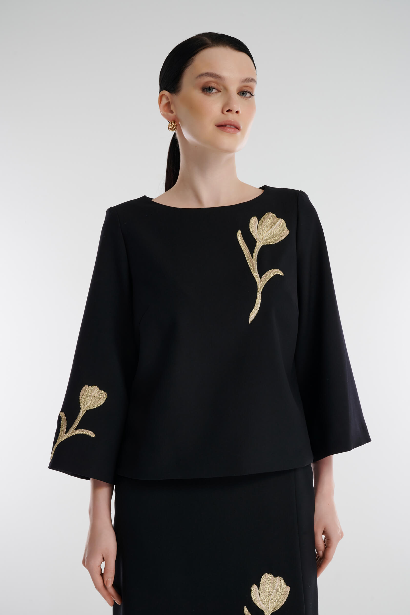 Блузка из костюмной ткани меняет представление о нарядной классике. Свободный крой и лаконичный силуэт обеспечивают комфорт и универсальность, а цветочная вышивка добавляет утонченный акцент. В сочетании с юбкой из той же линии блузка образует элегантный комплект для особых случаев.