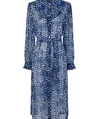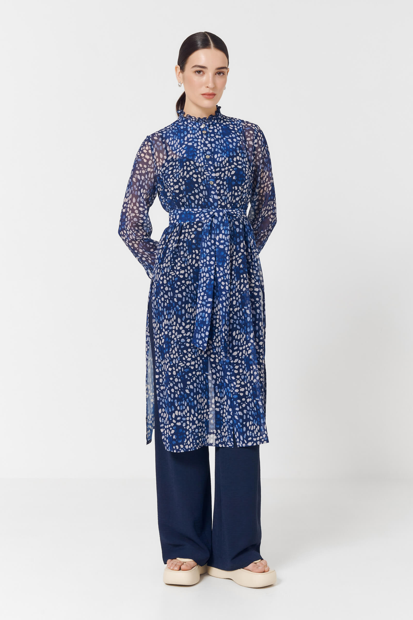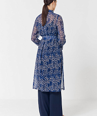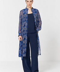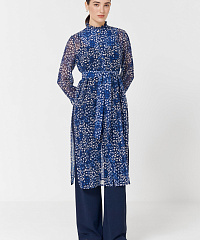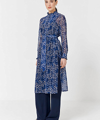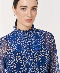 Легкая удлиненная блузка из струящейся вискозы с застежками на пуговицах и поясом. Оборки по вороту и на рукавах придадут нотку романтики, а боковые разрезы не будут стеснять ваших движений. Абстрактный принт будет отлично сочетаться с любыми моно-брюками.