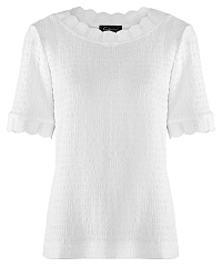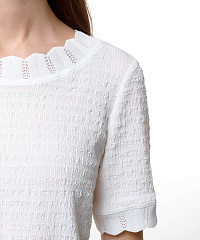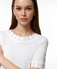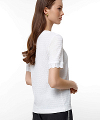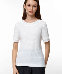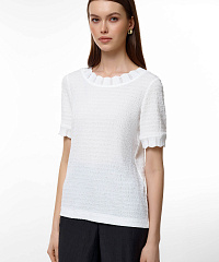 Белая блузка — идеальный выбор для теплых дней. Изготовленная из легкой ткани с рифленой текстурой, она дарит комфорт и свободу движения. Оригинальный круглый вырез с рифленой отделкой добавляет нотку изысканности.