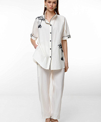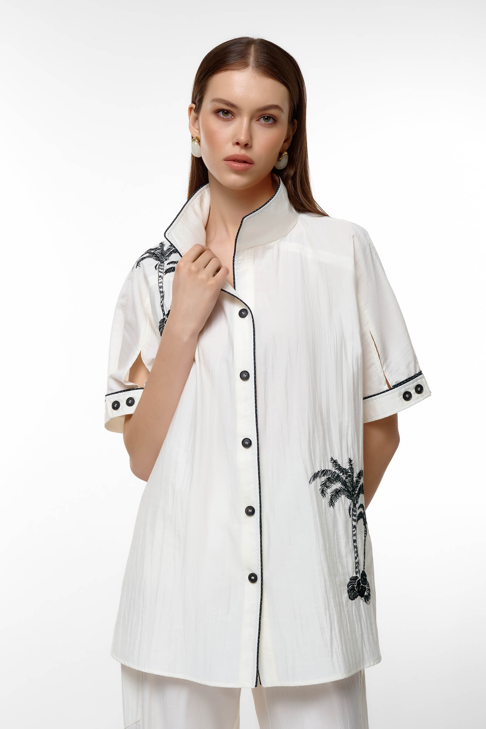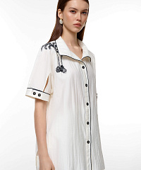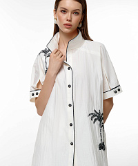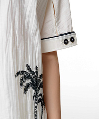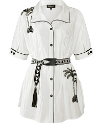 Преобразите свой гардероб с этой невероятной удлиненной блузкой, созданной для современных модниц. Элегантный белый цвет в сочетании с контрастной окантовкой и выразительными рисунками принесет свежесть и стиль в ваши образы. Блузка выполнена из легкой и дышащей ткани, что делает её идеальной для теплого сезона.