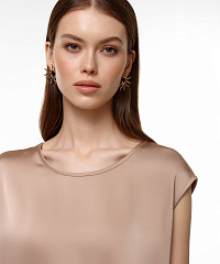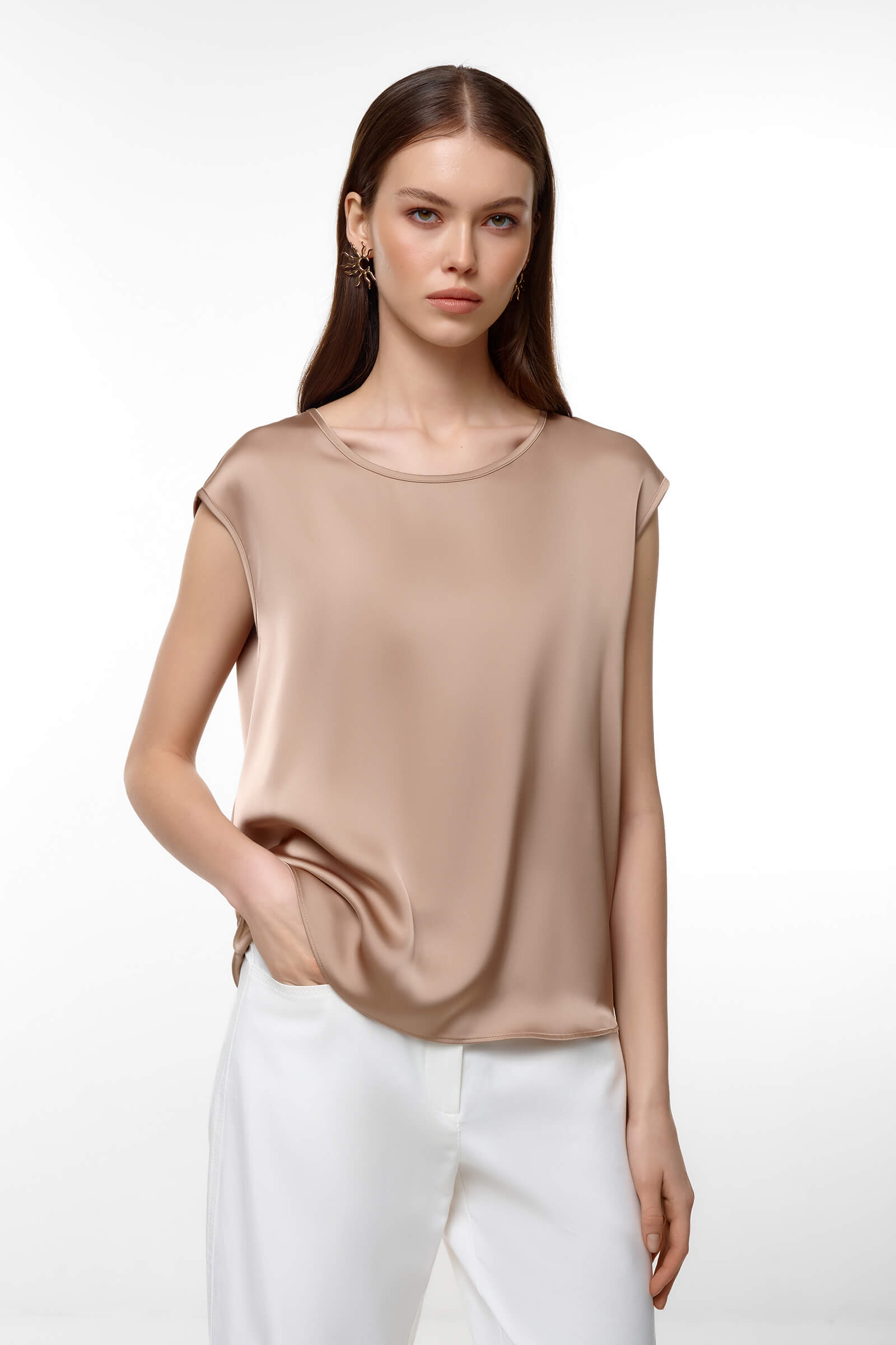 Элегантный топ со струящейся фактурой станет универсальной основой гардероба. Лаконичный дизайн уместен и в деловых, и в вечерних образах. Свободный крой позволяет носить изделие навыпуск или заправленным — в любом варианте образ выглядит стильно и современно