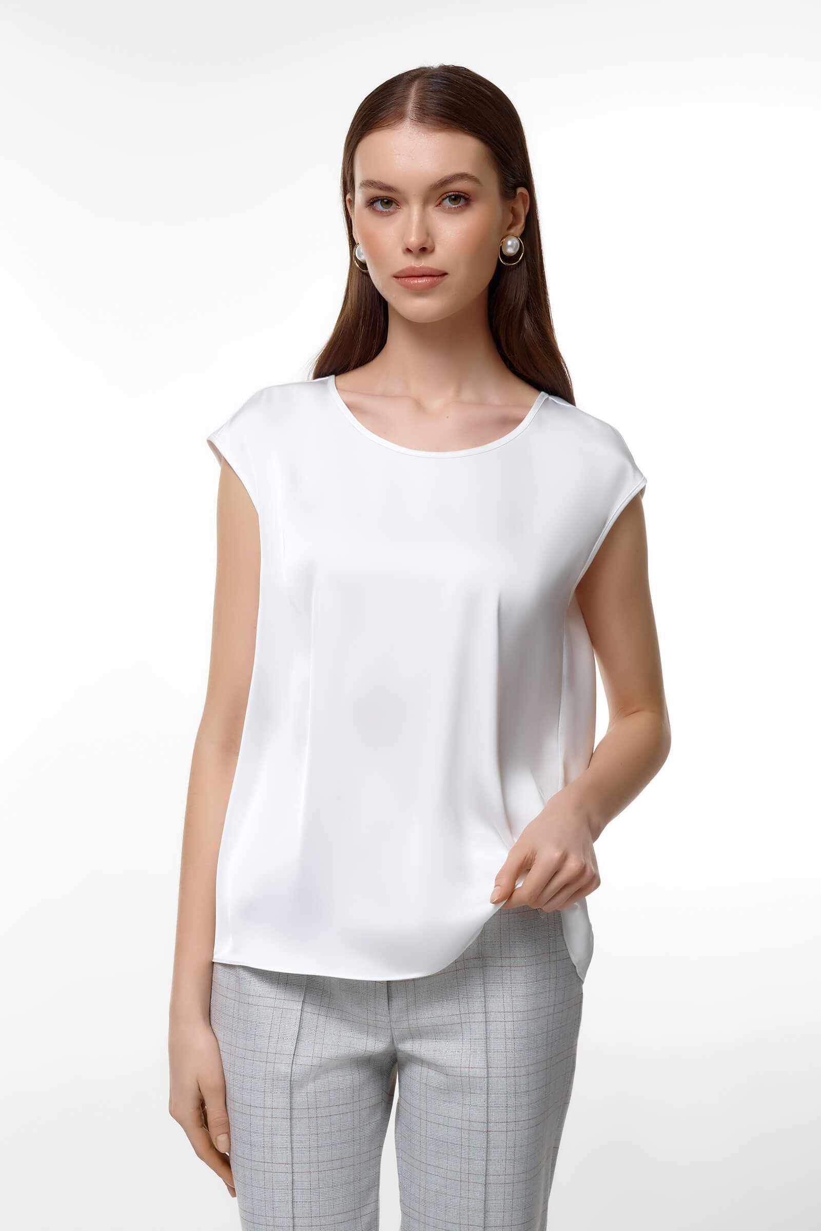 Элегантный топ со струящейся фактурой станет универсальной основой гардероба. Лаконичный дизайн уместен и в деловых, и в вечерних образах. Свободный крой позволяет носить изделие навыпуск или заправленным — в любом варианте образ выглядит стильно и современно