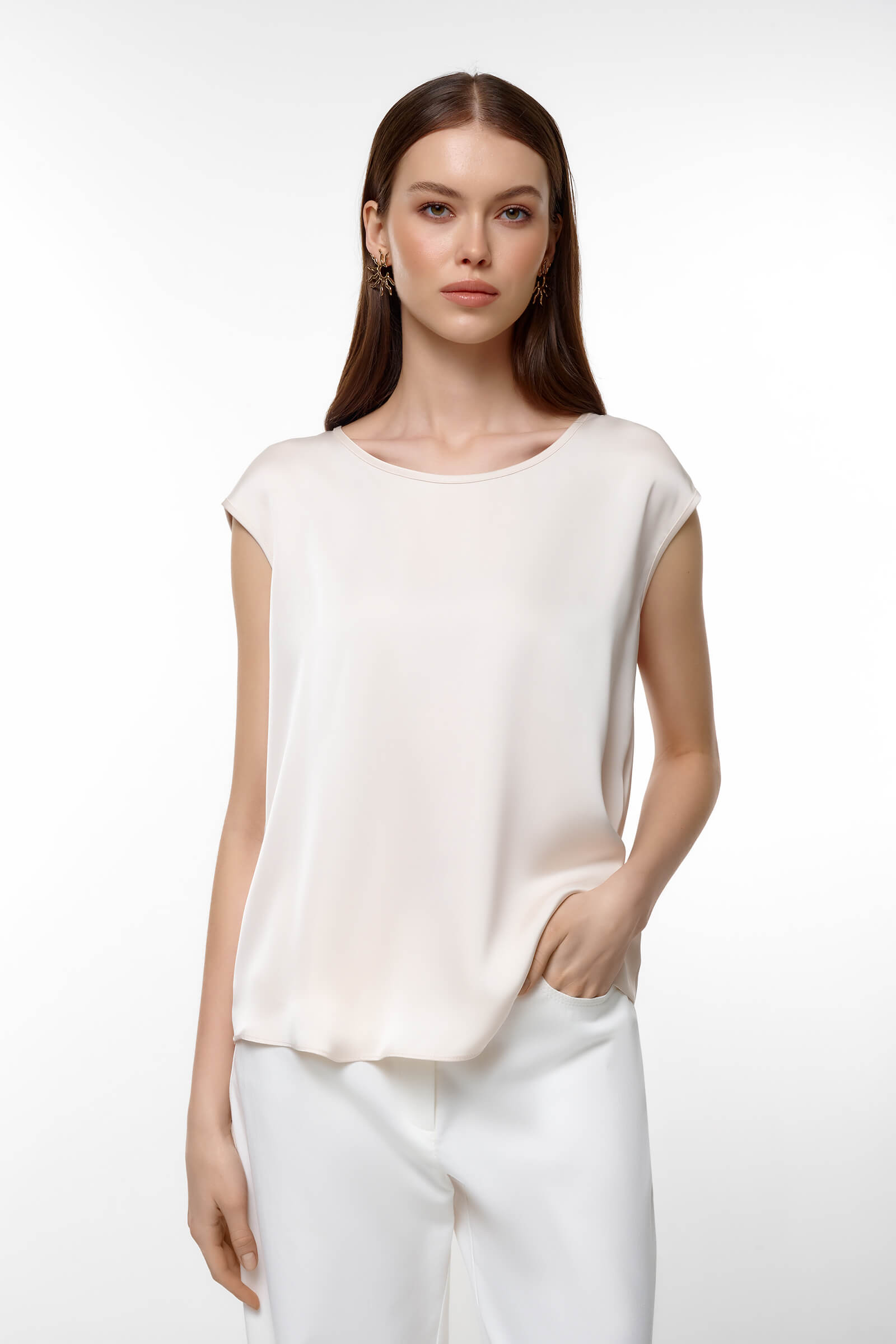Элегантный топ со струящейся фактурой станет универсальной основой гардероба. Лаконичный дизайн уместен и в деловых, и в вечерних образах. Свободный крой позволяет носить изделие навыпуск или заправленным — в любом варианте образ выглядит стильно и современно