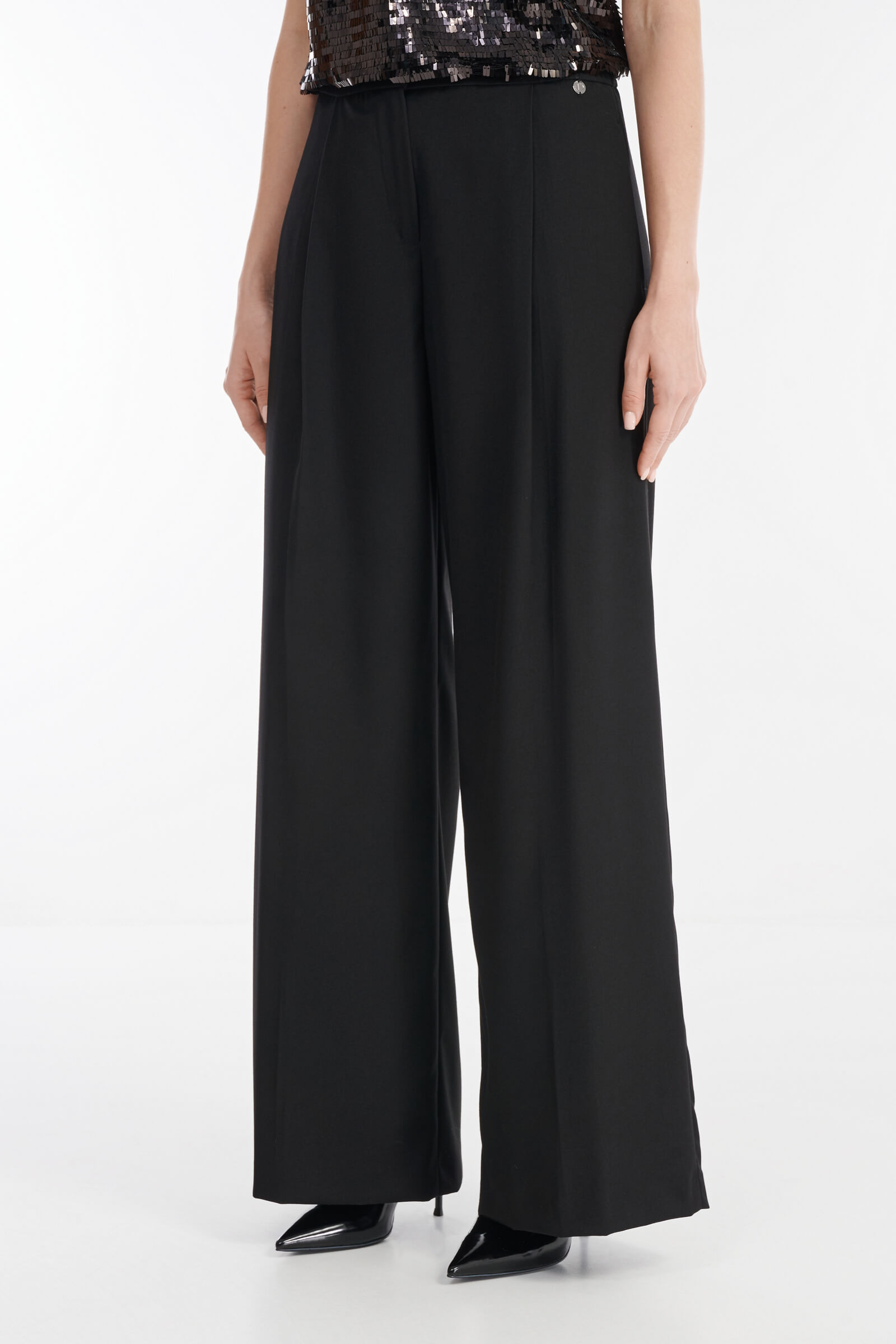 - Широкие брюки полной длины со стрелками и защипами