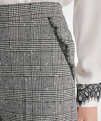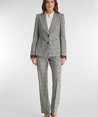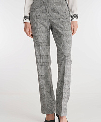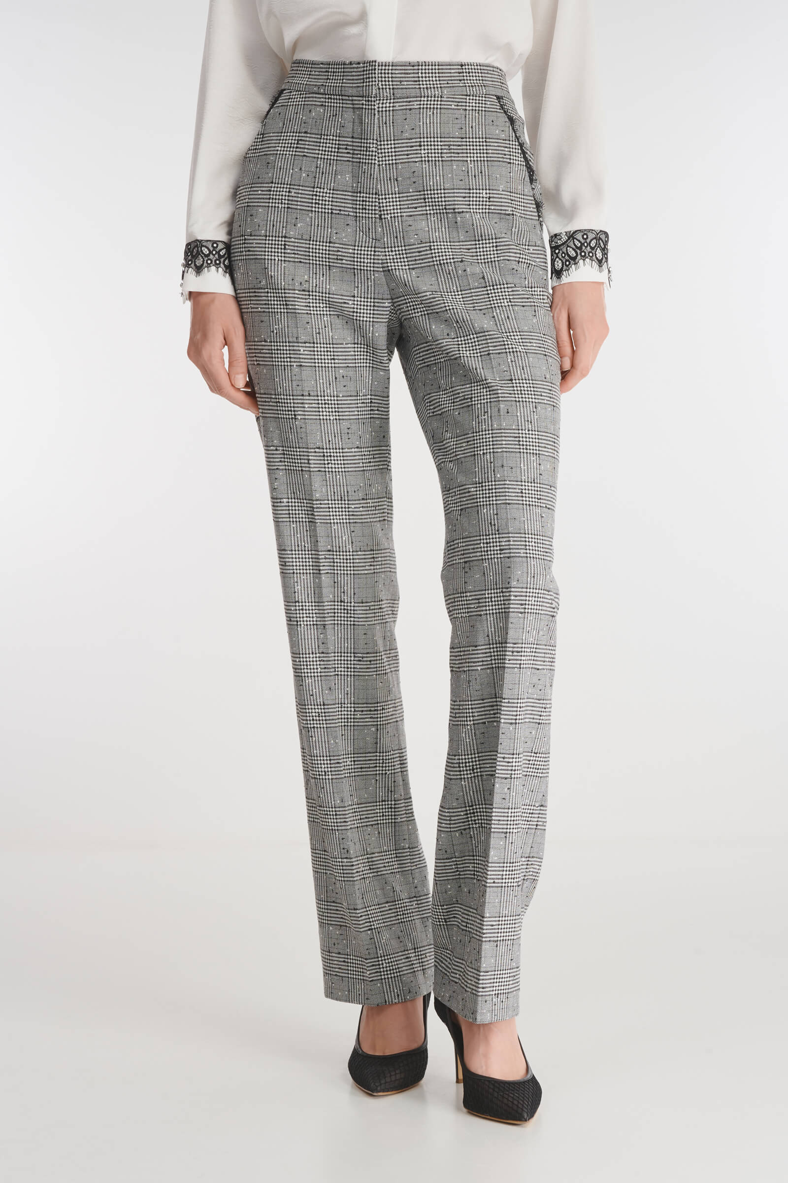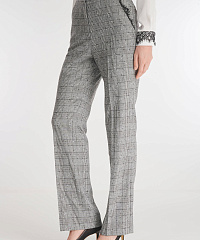 Брюки со стрелками классического прямого кроя отличаются эффектным дизайном. Для создания изделия был выбран легкий фактурный материал в небольшую крапинку, дополненный узором в клетку. Тончайшее фестончатое кружево, украшающее карманы, не перегружает дизайн, делая модель уместной как для деловой встречи, так и вечернего выхода в свет. В пару к брюкам можно подобрать пиджак из той же линейки для создания готового комплекта.