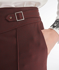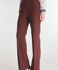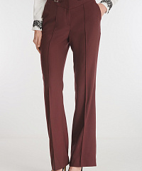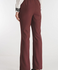 Брюки из костюмной ткани на основе вискозы привнесут в образы элегантности. Простроченные стрелки и слегка расклешенный крой визуально вытягивают силуэт. Пояс с резинкой сзади дополнен декоративными хлястиками, выделяющими талию.