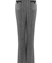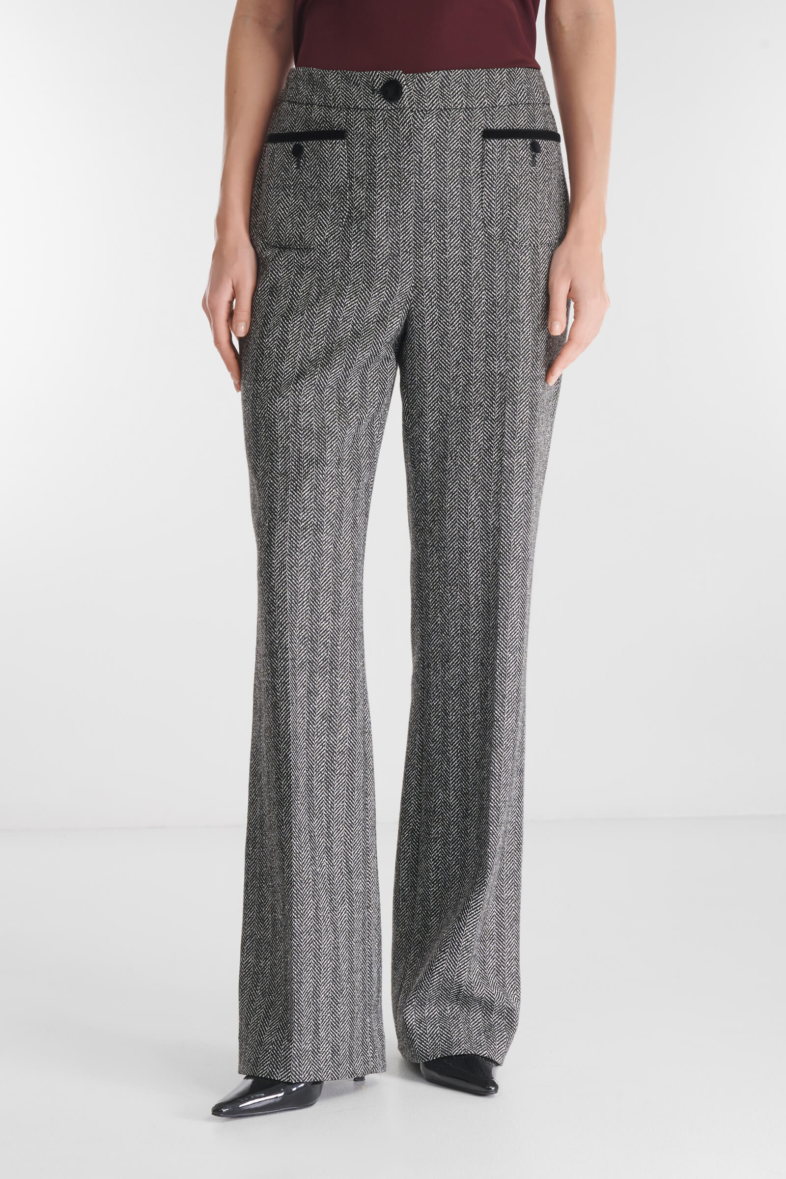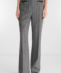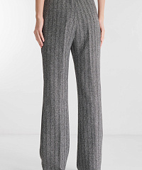 Брюки из костюмного материала на основе вискозы и хлопка сочетают классический силуэт и выразительные детали. Принт «елочка» и бархатная отделка придают модели благородный акцент, а высокая посадка и пояс с эластичной вставкой обеспечивают комфортную посадку. Носите с пиджаком из той же линейки, создавая элегантный цельный ансамбль.