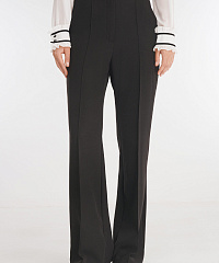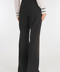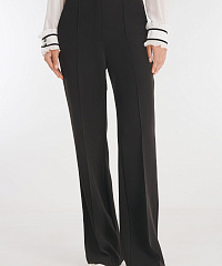 Элегантные расклешенные брюки станут универсальным дополнением любого гардероба. Модель выполнена из плотной костюмной поливискозы. Простроченные стрелки визуально вытягивают силуэт. Пояс брюк дополнен резинкой для еще большего комфорта.