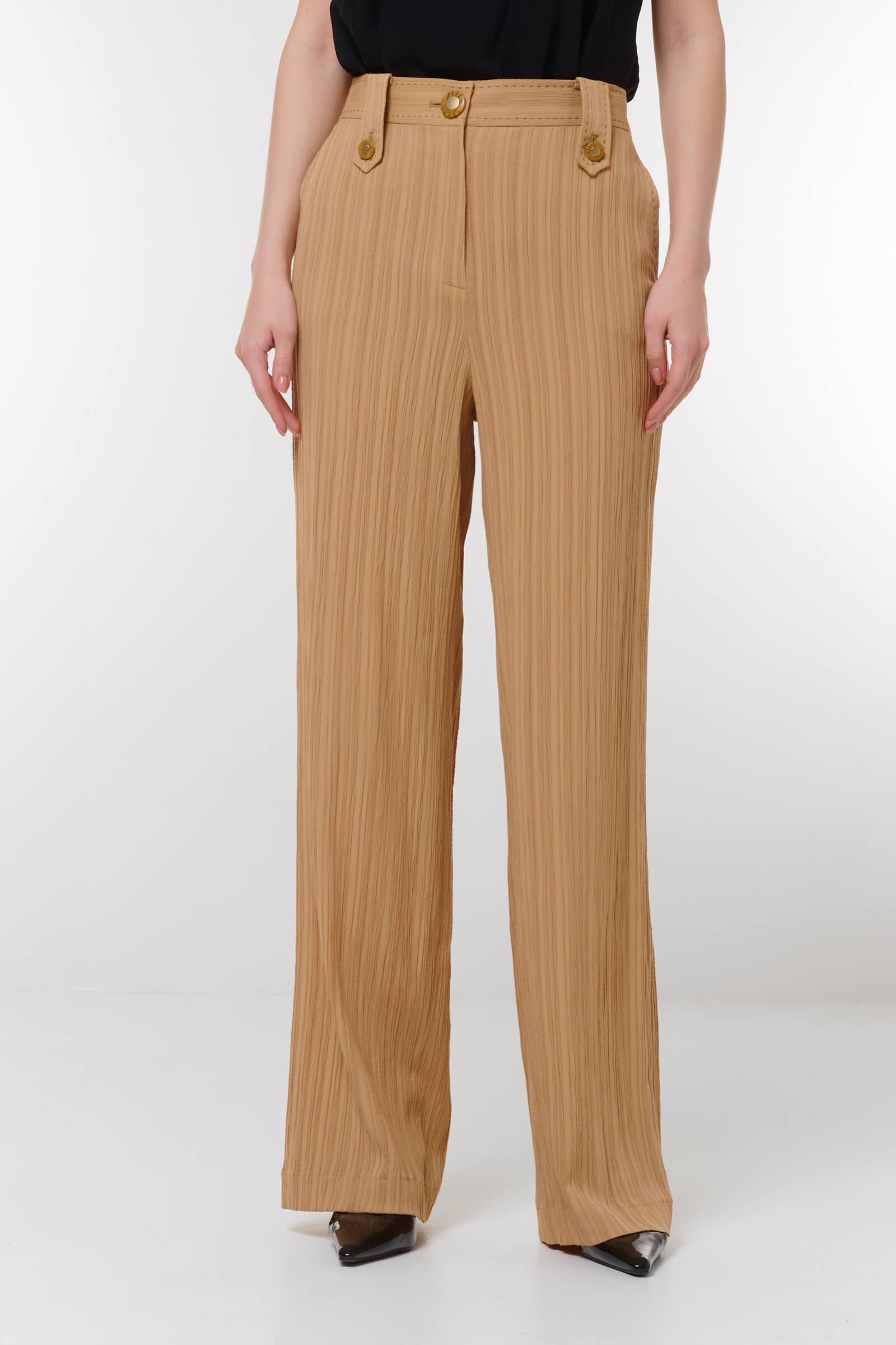 Эти стильные брюки из фактурного материала — идеальное дополнение к вашему гардеробу. Прямой крой создает элегантный силуэт, делая брюки подходящими как для повседневных, так и для более формальных образов.