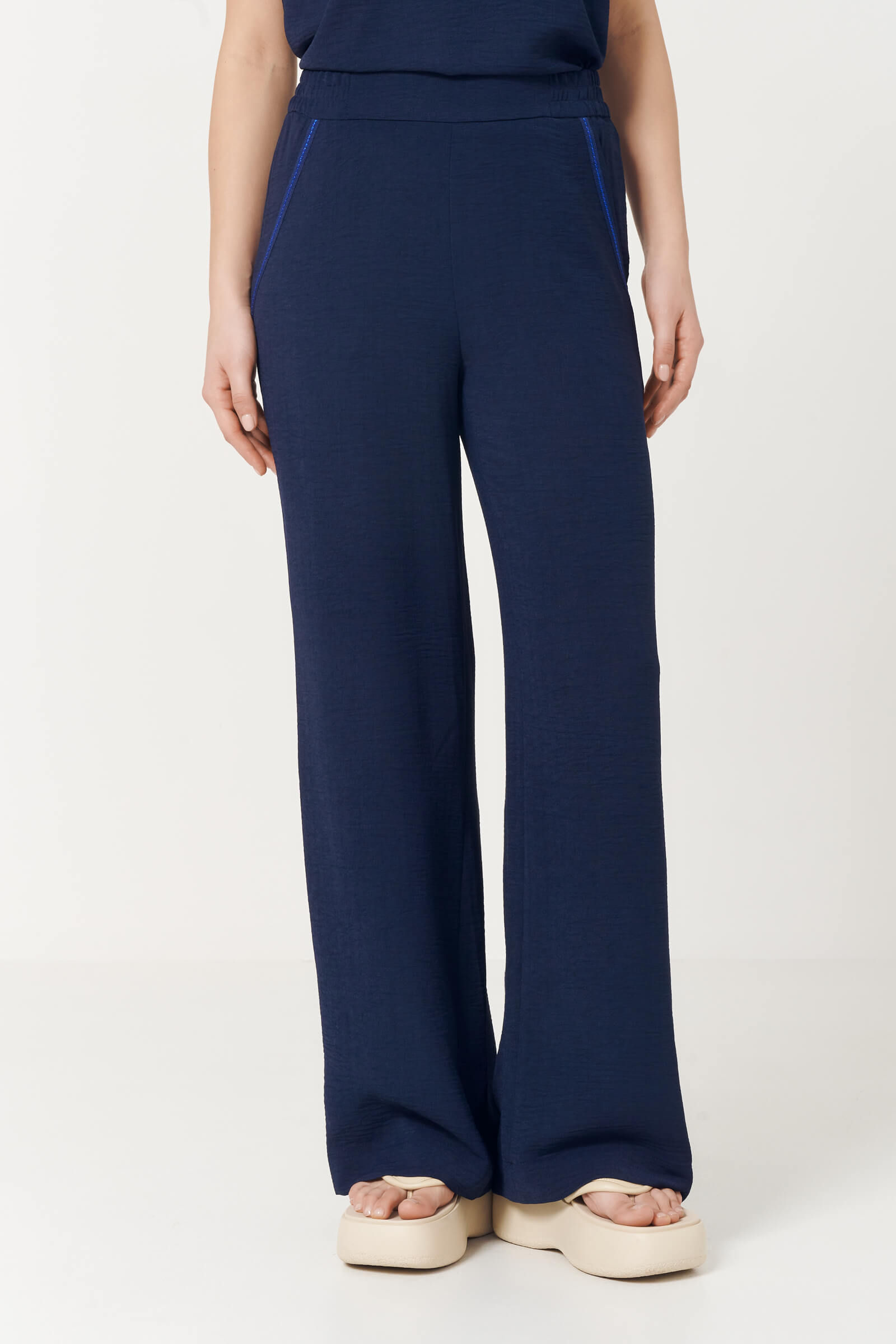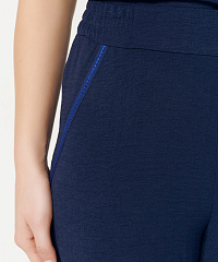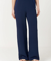 Широкие брюки выполнены из мягкого из муслина, эластичная резинка обеспечивает комфортную посадку. Контрастная отделка строчкой на карманах придает изюминку и добавляет нотку стиля бохо.