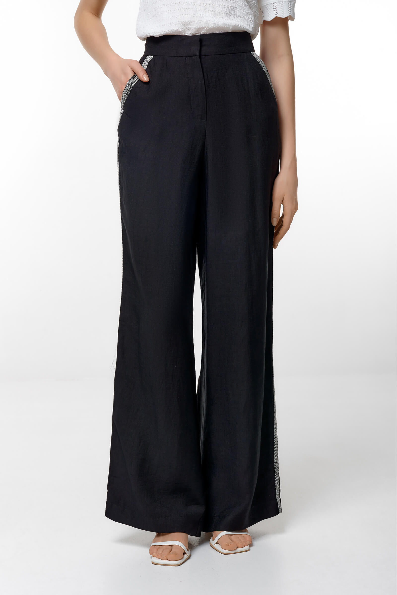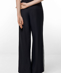 Идеальные брюки для особенных поводов и стильных повседневных сетов. Лампасы не только визуально вытягивают силуэт, но и становятся акцентной деталью, делающей дизайн изделия менее строгим и формальным. Пояс с резинкой обеспечивает комфортную посадку на талии. К брюкам получится подобрать гармоничный жакет из коллекции Caterina Leman.