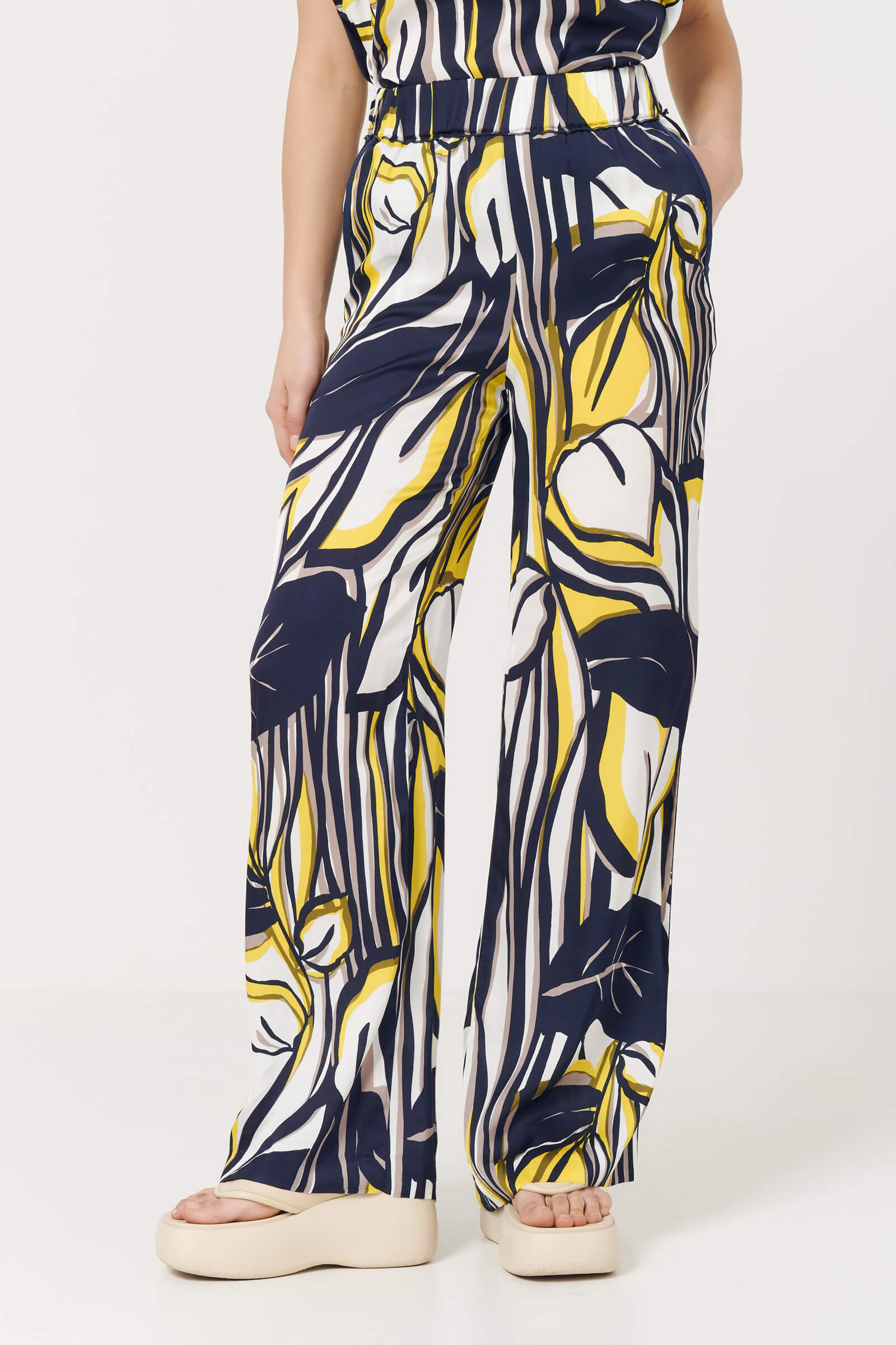 Широкие легкие брюки с абстрактным принтом и лампасами по бокам.