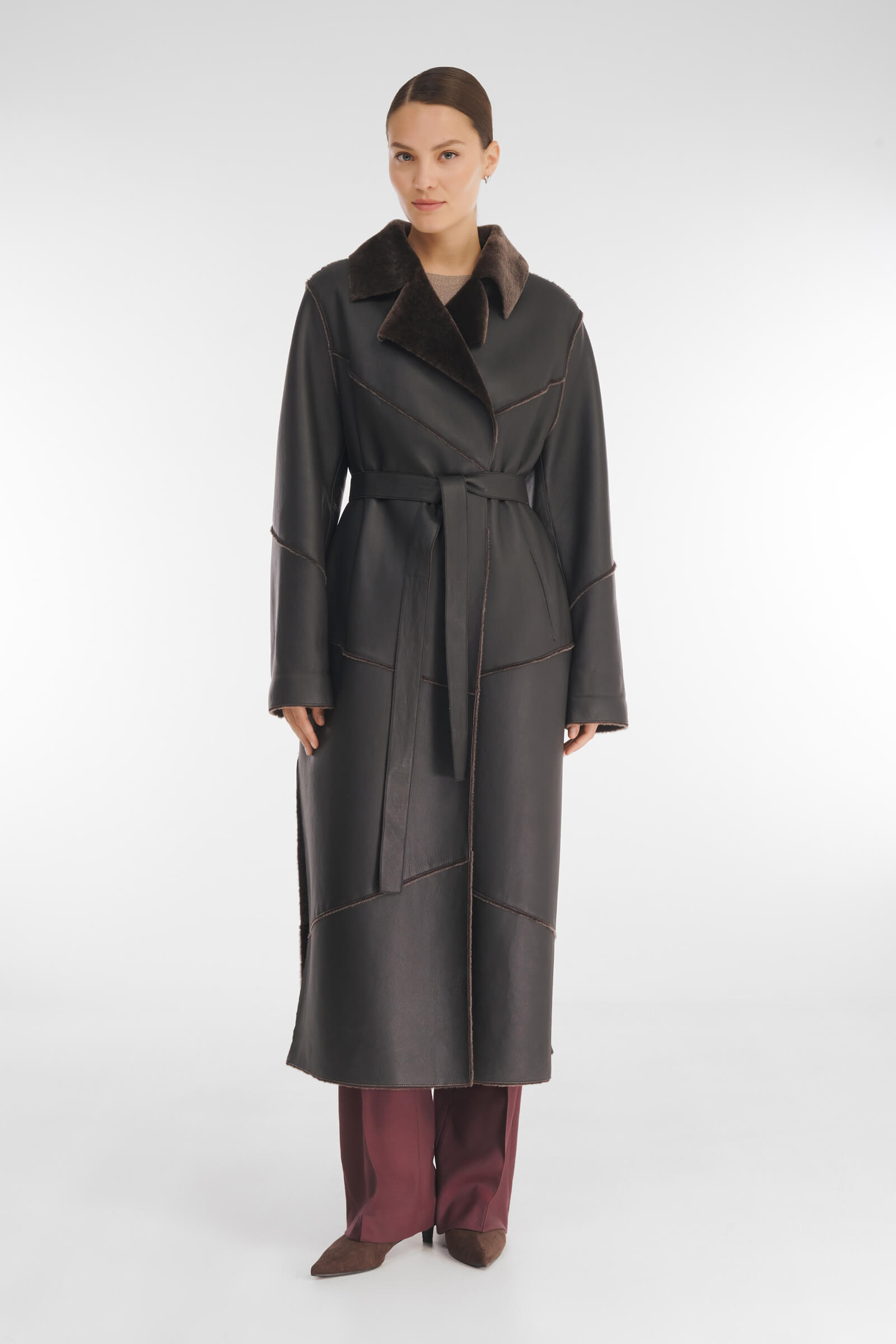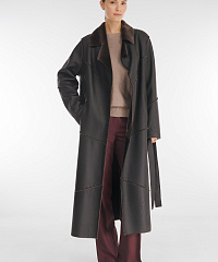 Элегантная дубленка длины мидакси, выполненная из натуральной кожи с роскошным мехом с внутренней стороны. Модель с классическим английским воротником и скрытой застежкой на кнопках, которые подчеркивают строгость дизайна. Удобство обеспечивают прорезные карманы и высокие боковые разрезы, добавляющие легкости движениям.