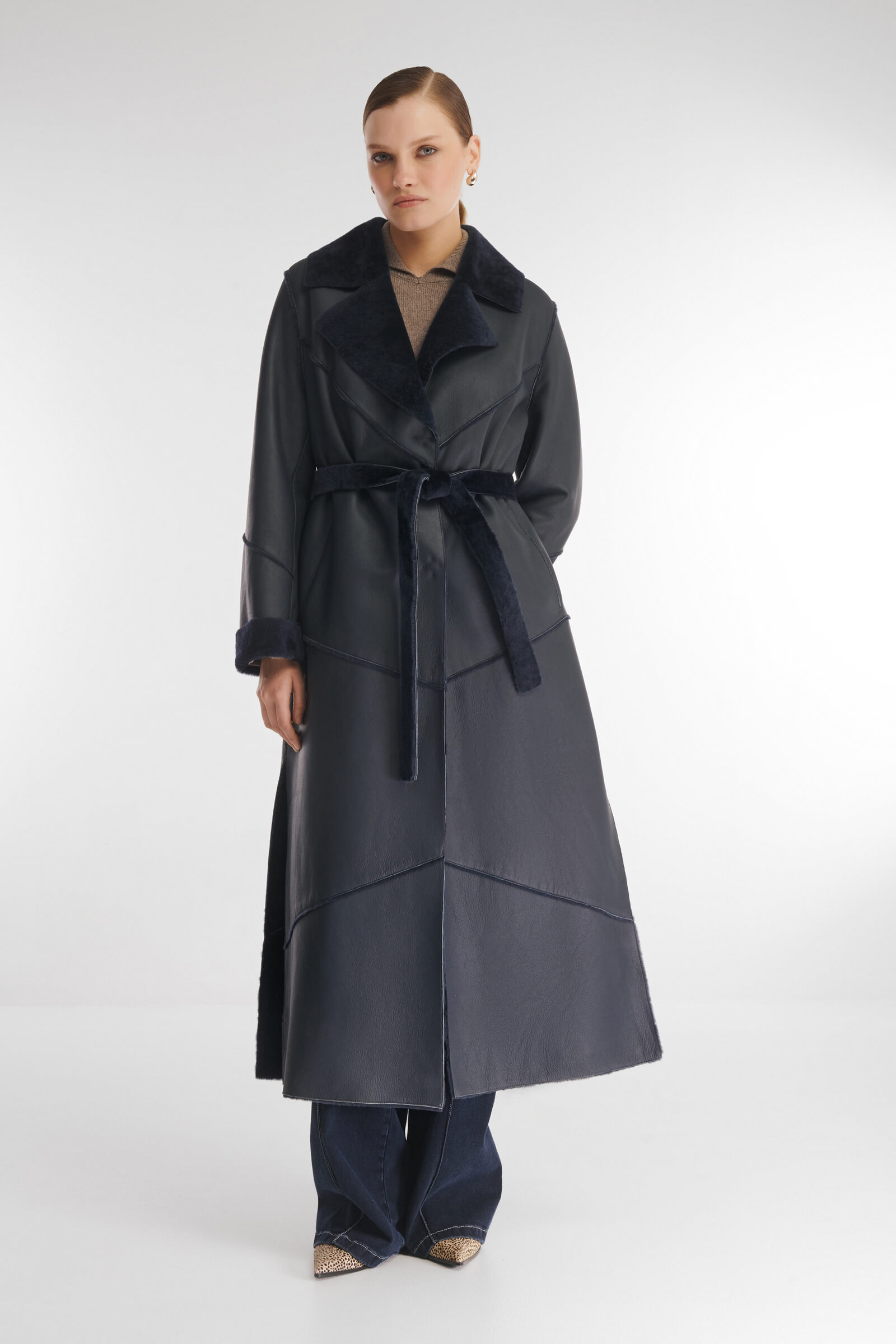 Элегантная дубленка длины мидакси, выполненная из натуральной кожи с роскошным мехом с внутренней стороны. Модель с классическим английским воротником и скрытой застежкой на кнопках, которые подчеркивают строгость дизайна. Удобство обеспечивают прорезные карманы и высокие боковые разрезы, добавляющие легкости движениям.