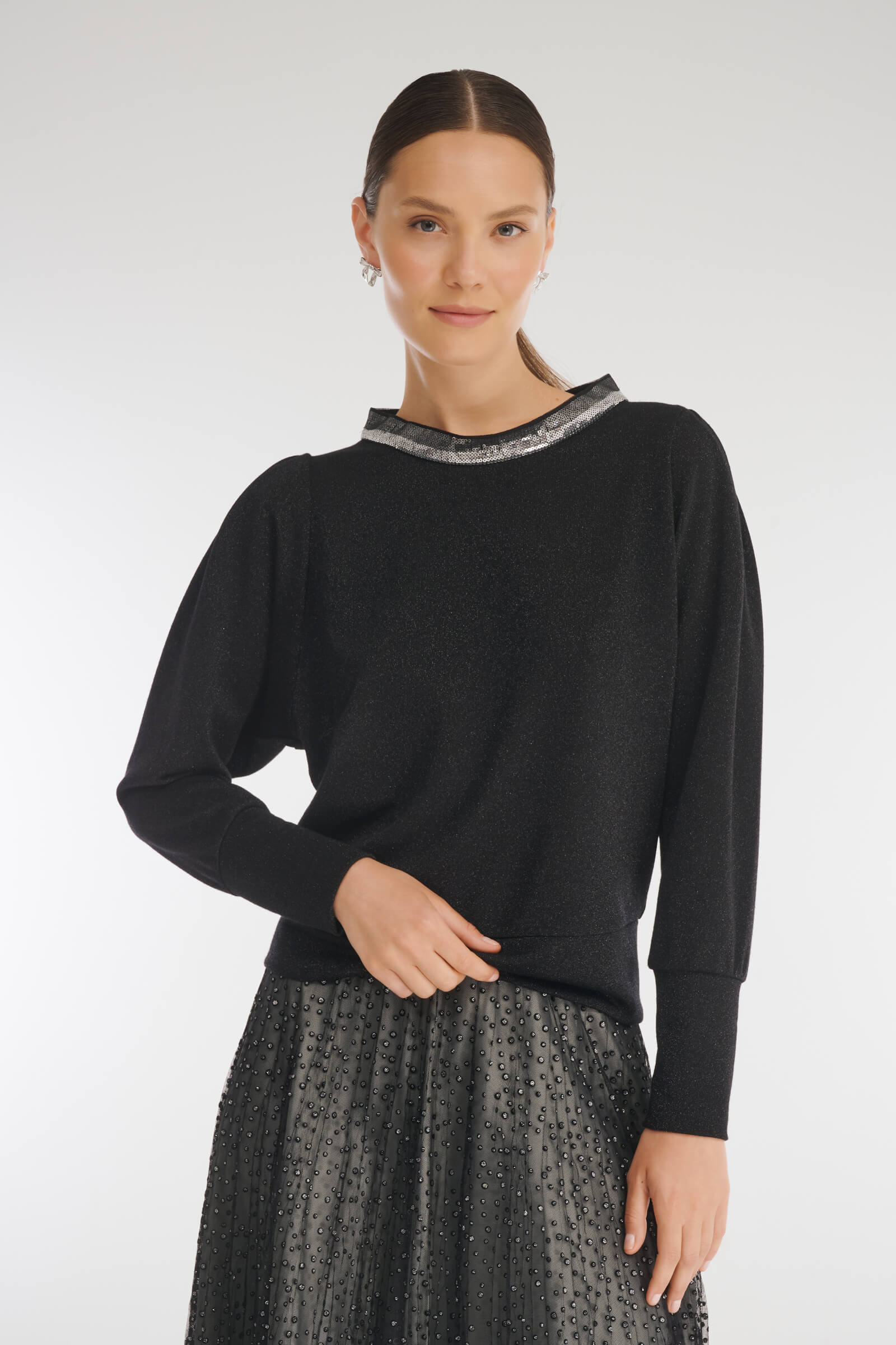 Джемпер из тонкого трикотажа с мерцающим люрексом — для тех, кто выбирает эффектный дизайн без ущерба комфорту. Небольшой воротник-воронка декорирован пайетками. Свободный крой не сковывает движений.