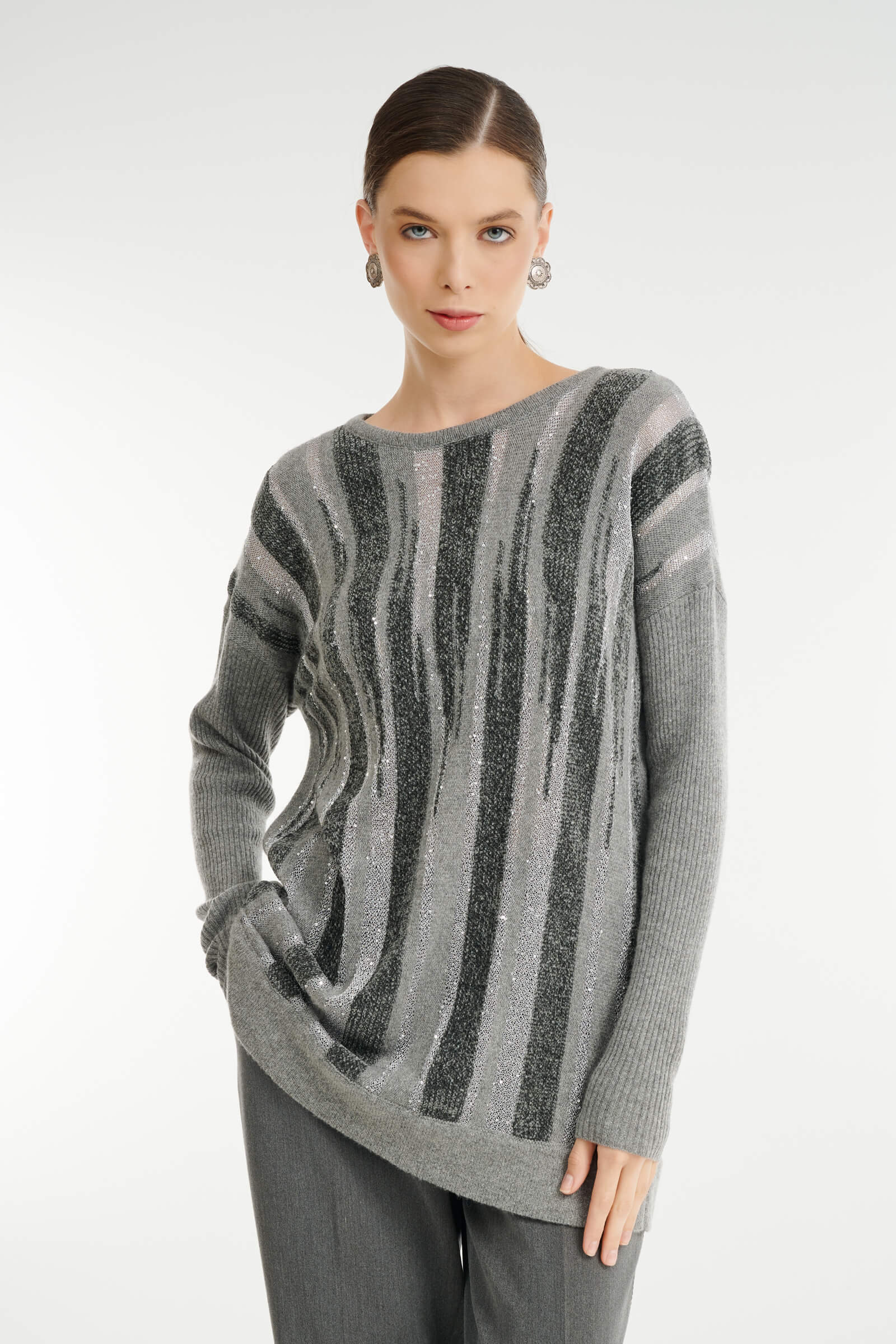 - Джемпер украшен узором с добавлением металлизированной нити и пайеток