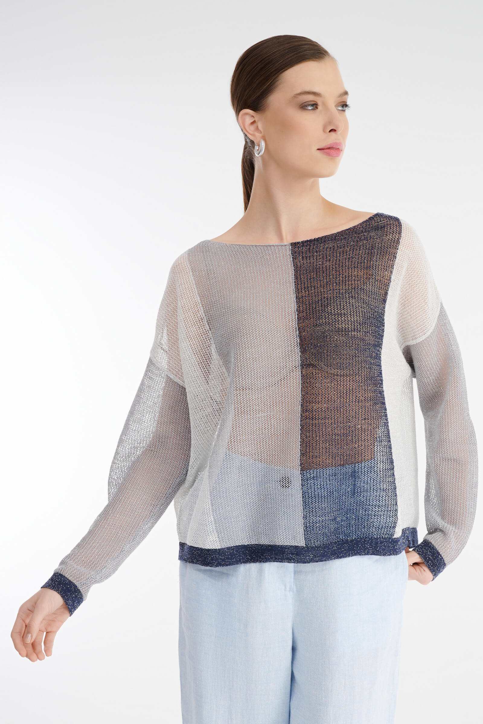 • Джемпер выполнен в стиле колор-блок и украшен люрексом