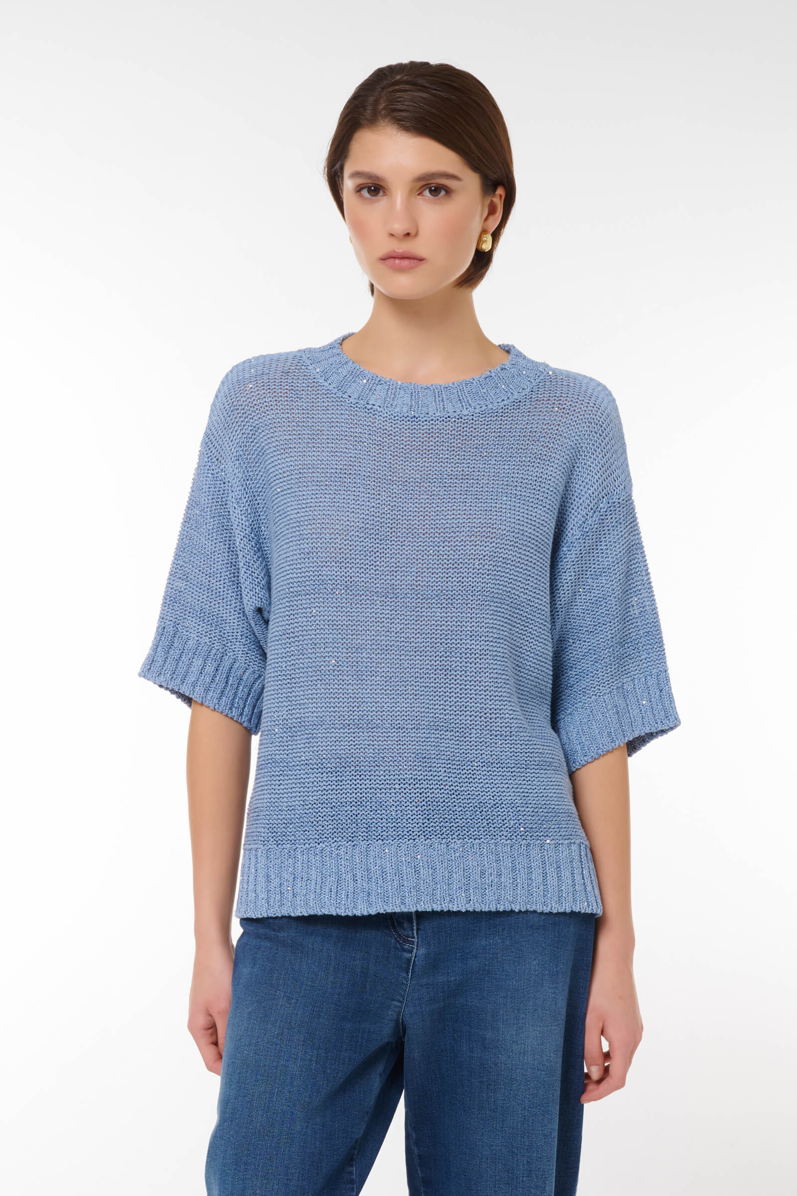 Джемпер с пайетками, который станет незаменимым элементом вашего гардероба.Удобный крой и короткие рукава делают этот джемпер идеальным для повседневного стиля и особых случаев. Сочетайте его с джинсами или юбкой для создания стильного образа. Позвольте себе наслаждаться качеством и элегантностью в каждой детали!
