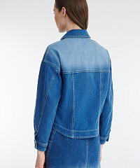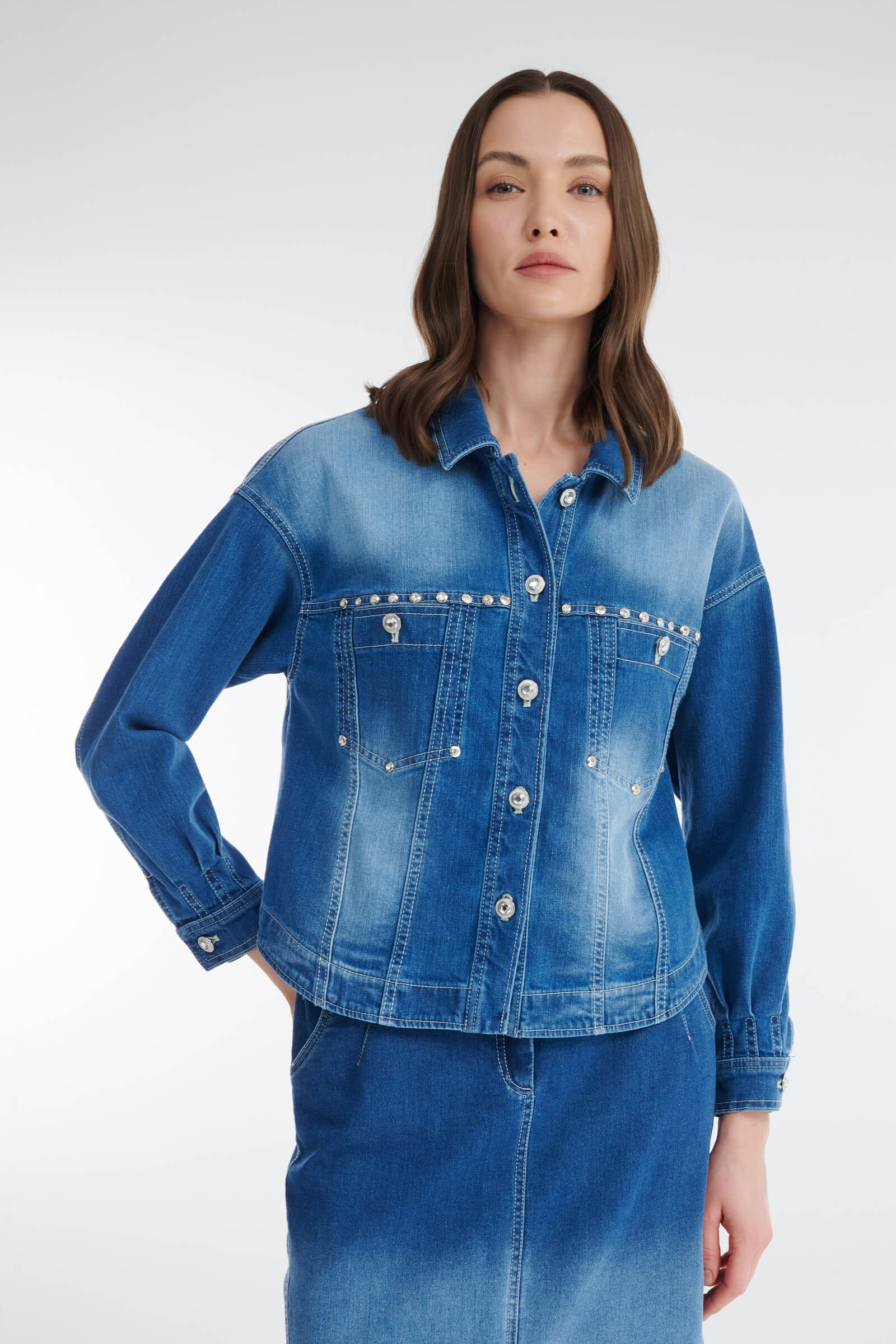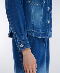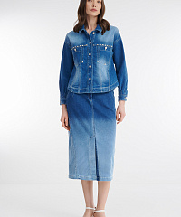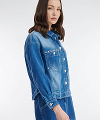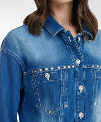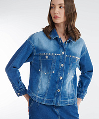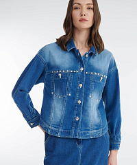 Стильный и универсальный элемент гардероба — куртка сшита из плотного денима. Спущенная линия плеча и прямой крой создают стильный расслабленный городской образ. Декоративные хольнитены и пуговицы со стразами добавляют блеска. Модель идеально сочетается с джинсовой юбкой из той же линейки, а также с легкими платьями, брюками или джинсами, создавая как повседневные, так и более нарядные образы.