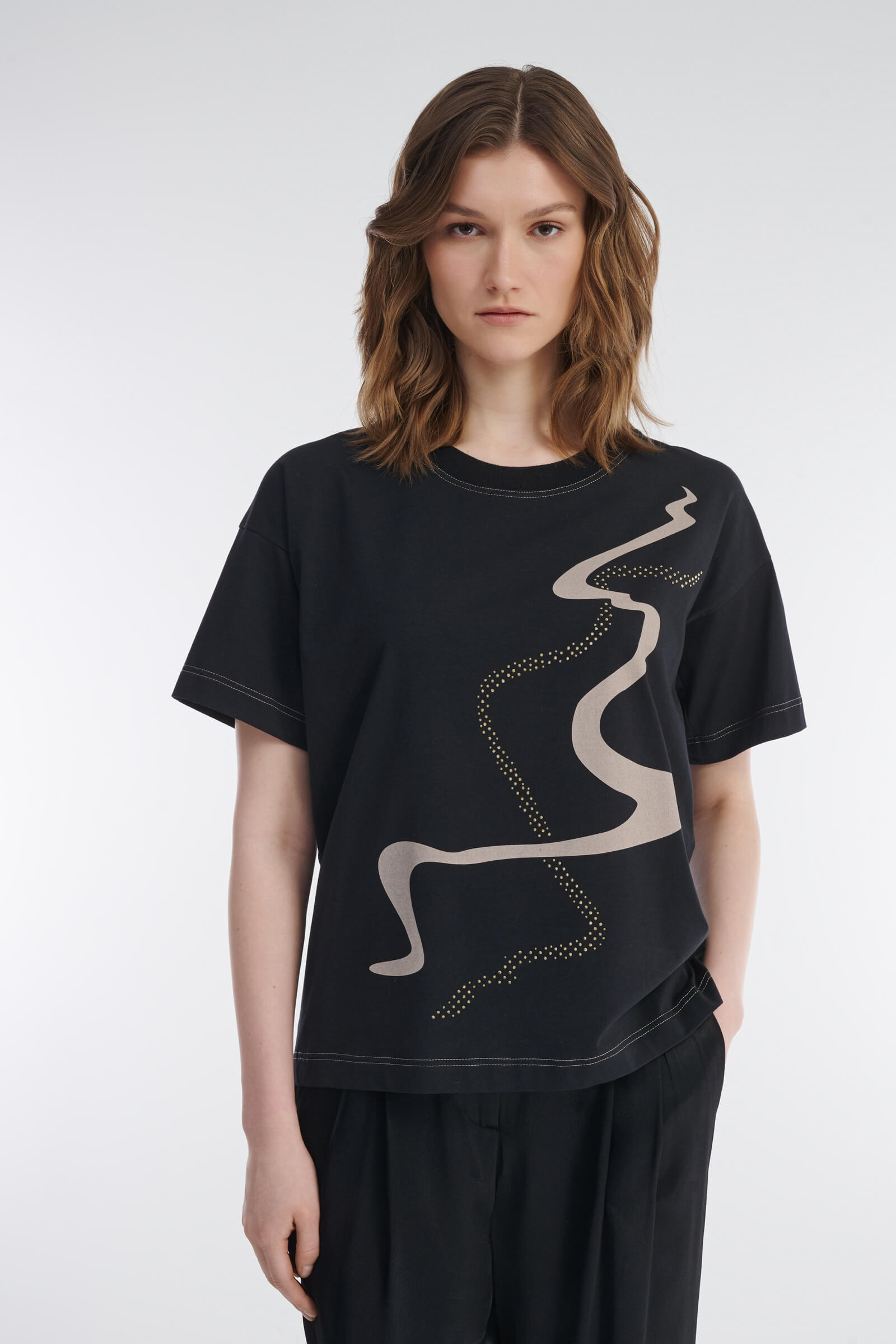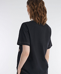 Базовая футболка с круглым вырезом и коротким рукавом — стильное сочетание комфорта и ярких деталей. Прямой крой и спущенная линия плеча создают расслабленный силуэт, а мягкий хлопок с небольшим добавлением эластана обеспечивает комфорт в носке. Контрастные швы добавляют акцент, а принт, украшенный переливающимися стразами, делает образ наряднее. Футболка идеально сочетается с джинсами, юбками и брюками, позволяя создавать как повседневные, так и более эффектные образы.