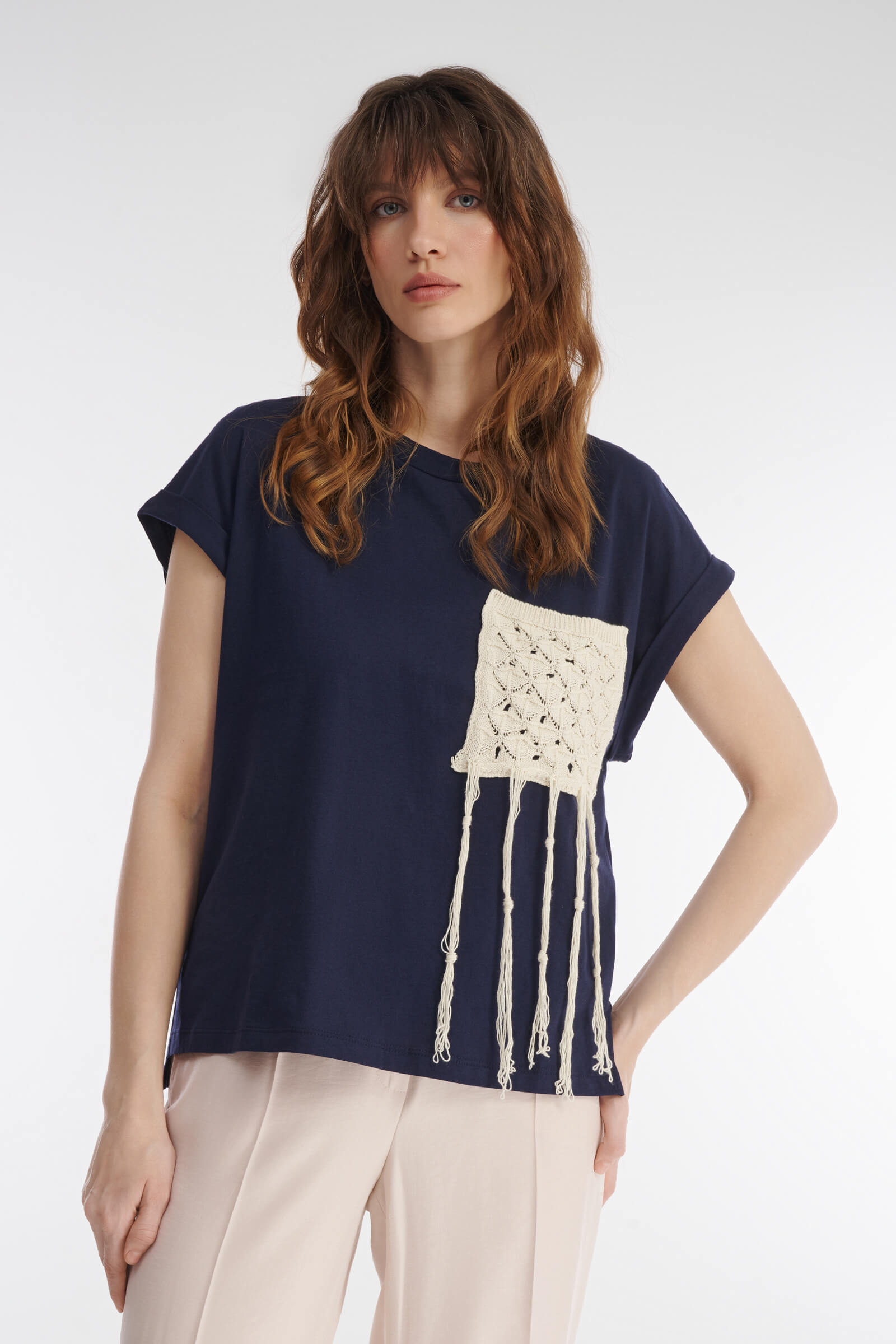 Футболка с круглым вырезом выглядит легко и непринужденно. Благодаря мягкому хлопку и свободному крою модель комфортна и удобна в носке. Короткие рукава с небольшими отворотами придают ощущение свободы и легкости. Изюминка модели — функциональный вязаный карман на груди. Сложный узор из переплетенных нитей выглядит необычно и добавляет элемент уникальной ручной работы, выделяя эту модель среди других.