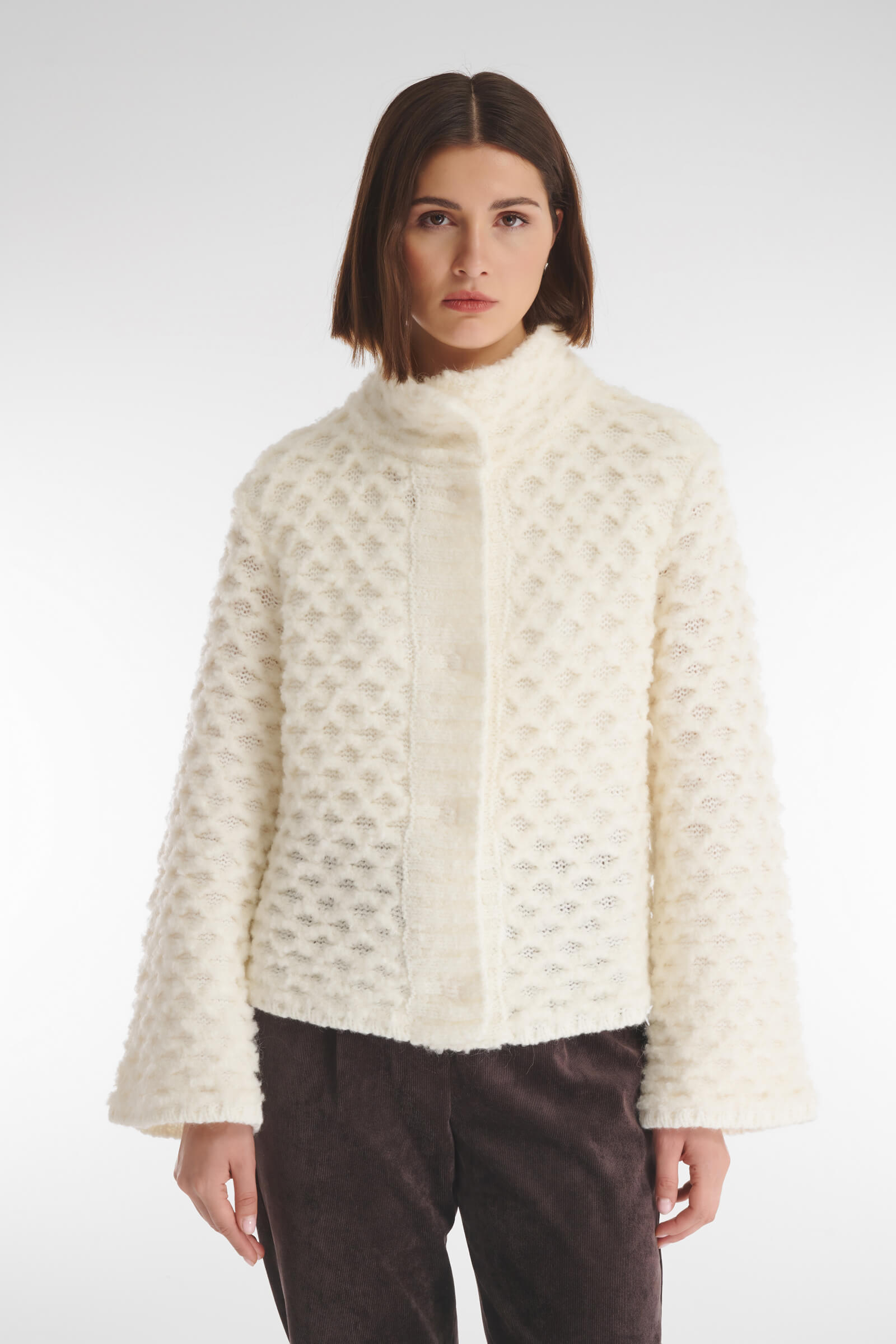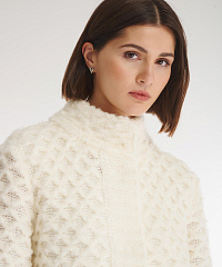 Интересный фактурный кардиган станет акцентной деталью ваших образов. Все благодаря необычному объемному узору, напоминающему пчелиные соты. Мягкий и приятный на ощупь материал дарит комфортные ощущения во время носки: вирджинская шерсть в составе отвечает за тепло, в то время как мохер добавляет изделию мягкости.