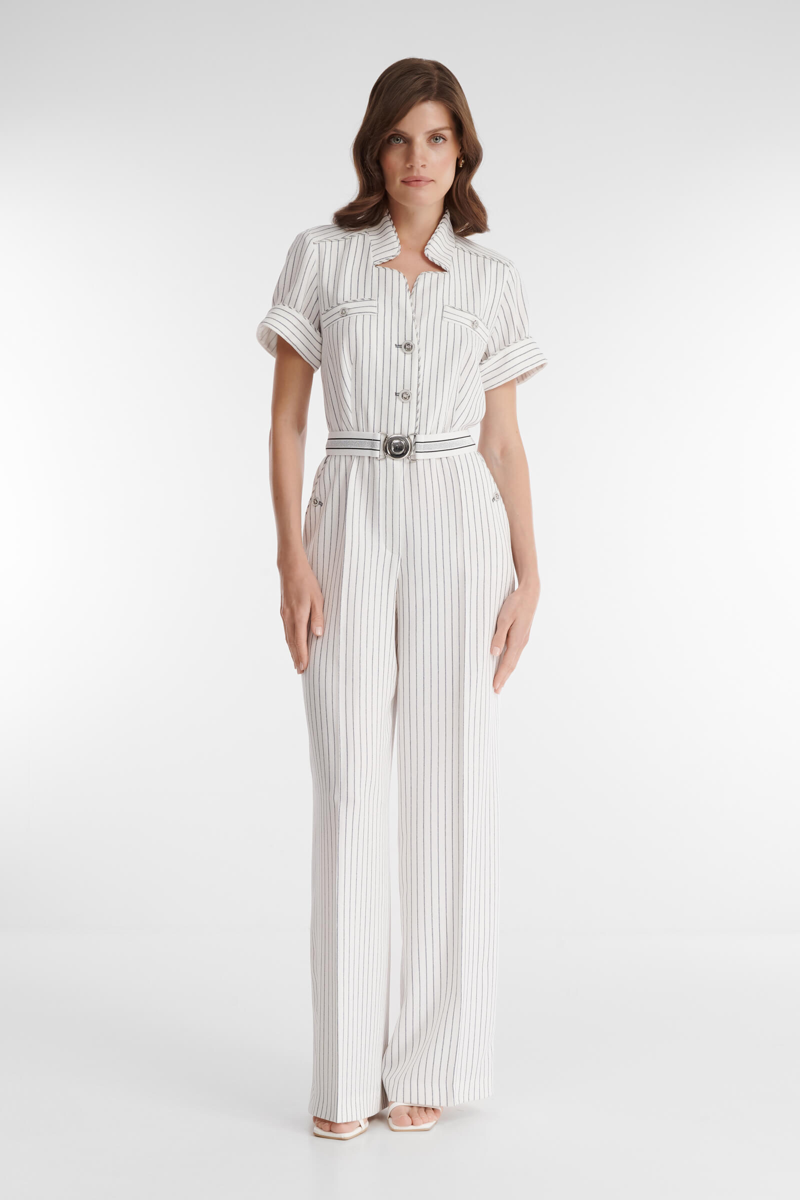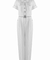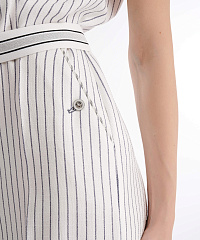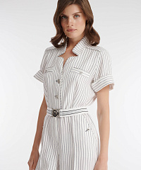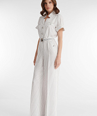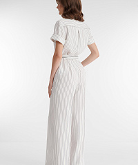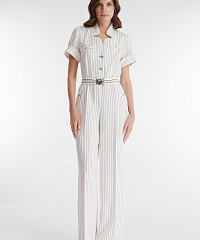 Идеальный комбинезон для городских летних образов. Легкий фактурный материал на основе вискозы украшен вертикальной полоской, которая визуально вытягивает силуэт. Скрытая резинка на талии обеспечивает красивую и комфортную посадку. Дизайн комбинезона подчеркнут декоративной тесьмой с люрексом, слегка мерцающей во время носки.