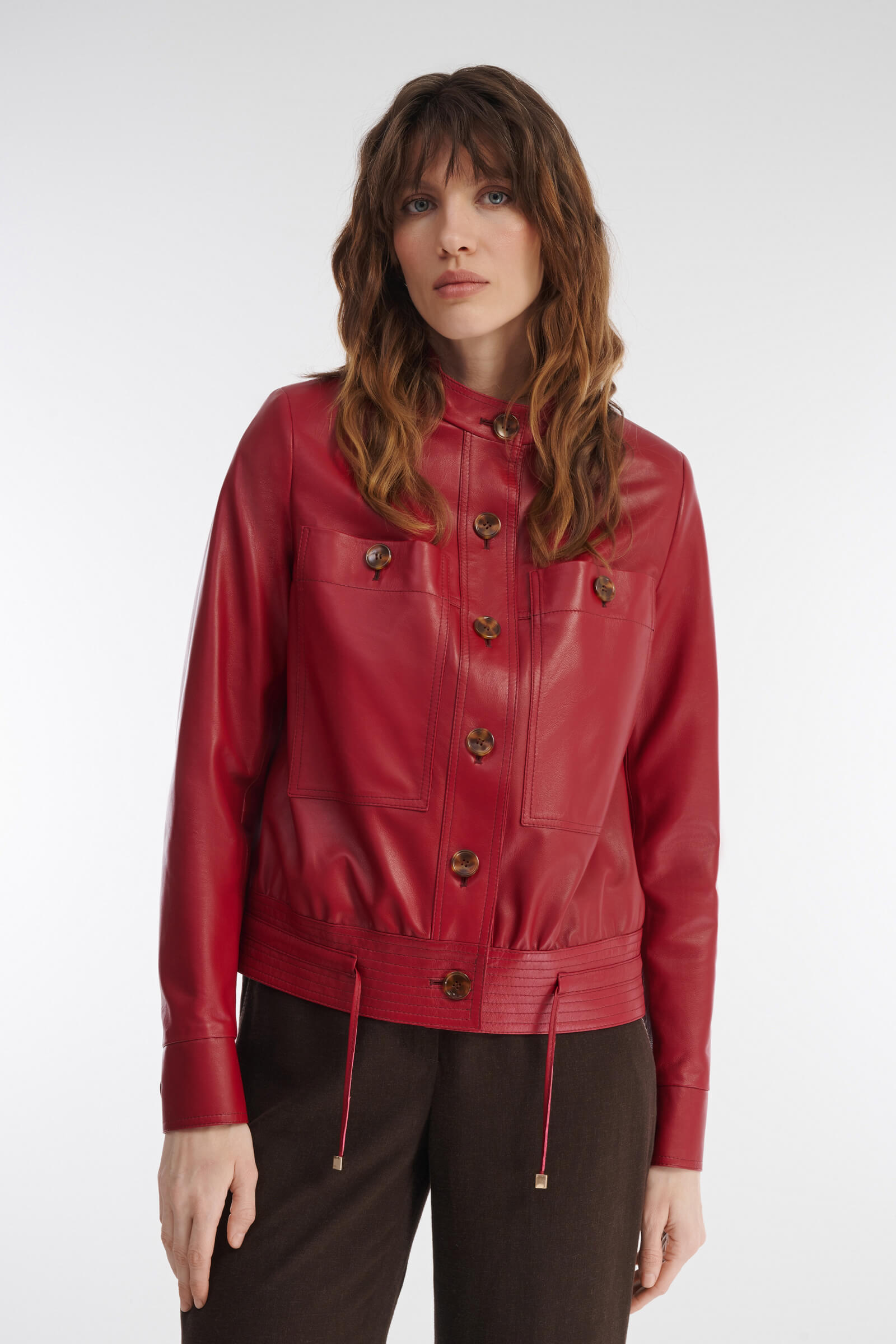 Укороченная куртка из кожи ягненка с застежкой на пуговицы — элегантный выбор современной женщины. Кулиска со шнурком позволяет регулировать силуэт, а стильный акцент в виде объемных нагрудных карманов обеспечивает удобство. Лаконичный дизайн делает эту куртку универсальным элементом гардероба, который легко сочетать с различными образами.