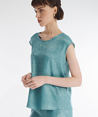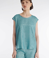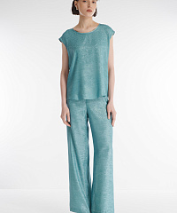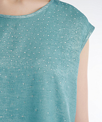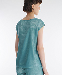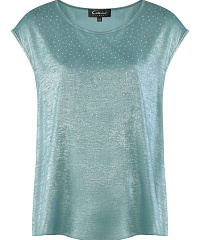 Топ с коротким рукавом идеально подойдет для особенных моментов. Модель из смесового материала с красивым металлическим блеском украшена россыпью мелких страз. В пару к топу можно подобрать брюки из той же линейки для создания эффектного тотал-лука.