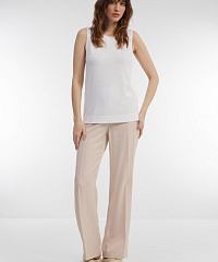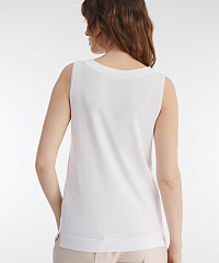 Базовый топ без рукавов с круглым вырезом — незаменимый элемент гардероба, который легко адаптируется к любому стилю. Модель гармонично смотрится как с классическими брюками и пиджаком, так и с джинсами и кедами. В теплое время его можно носить соло с юбками, шортами или льняными брюками, а в прохладные дни лаконичный крой делает топ идеальной основой для многослойных образов. Универсальный и практичный, топ станет незаменимым элементом стильного и функционального гардероба.