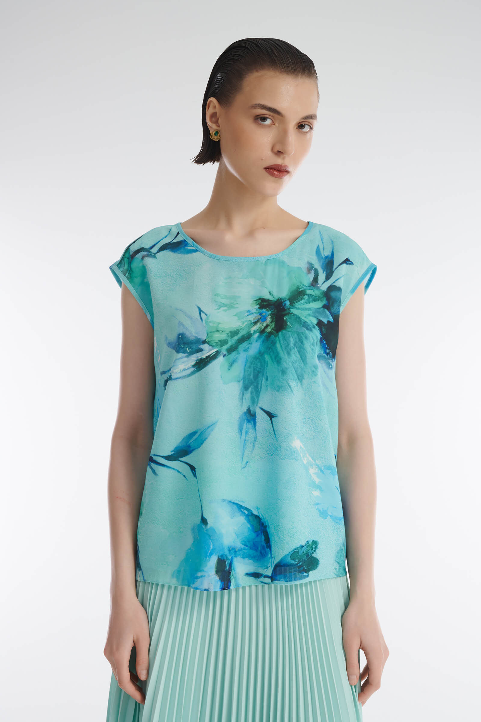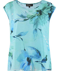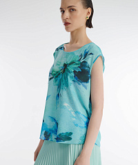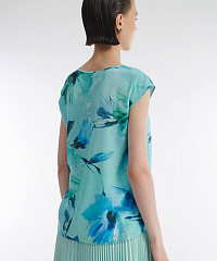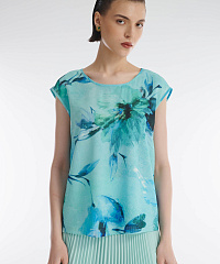 Топ с цветочным принтом выполнен из легкого смесового материала на основе вискозы. Модель дополнена тонким вшитым топом, уменьшающим прозрачность изделия.