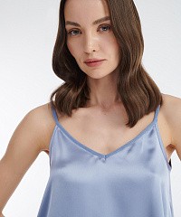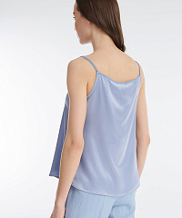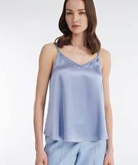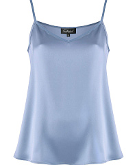 Атласный топ на тонких бретелях — воплощение изысканной простоты. Благодаря свободному крою ткань изящно драпируется, создавая мягкие красивые складки. Глубокий V-образный вырез акцентирует внимание на декольте. Универсальная модель отлично смотрится как в сочетании с костюмными пиджаками, так и с джинсами или юбкой.