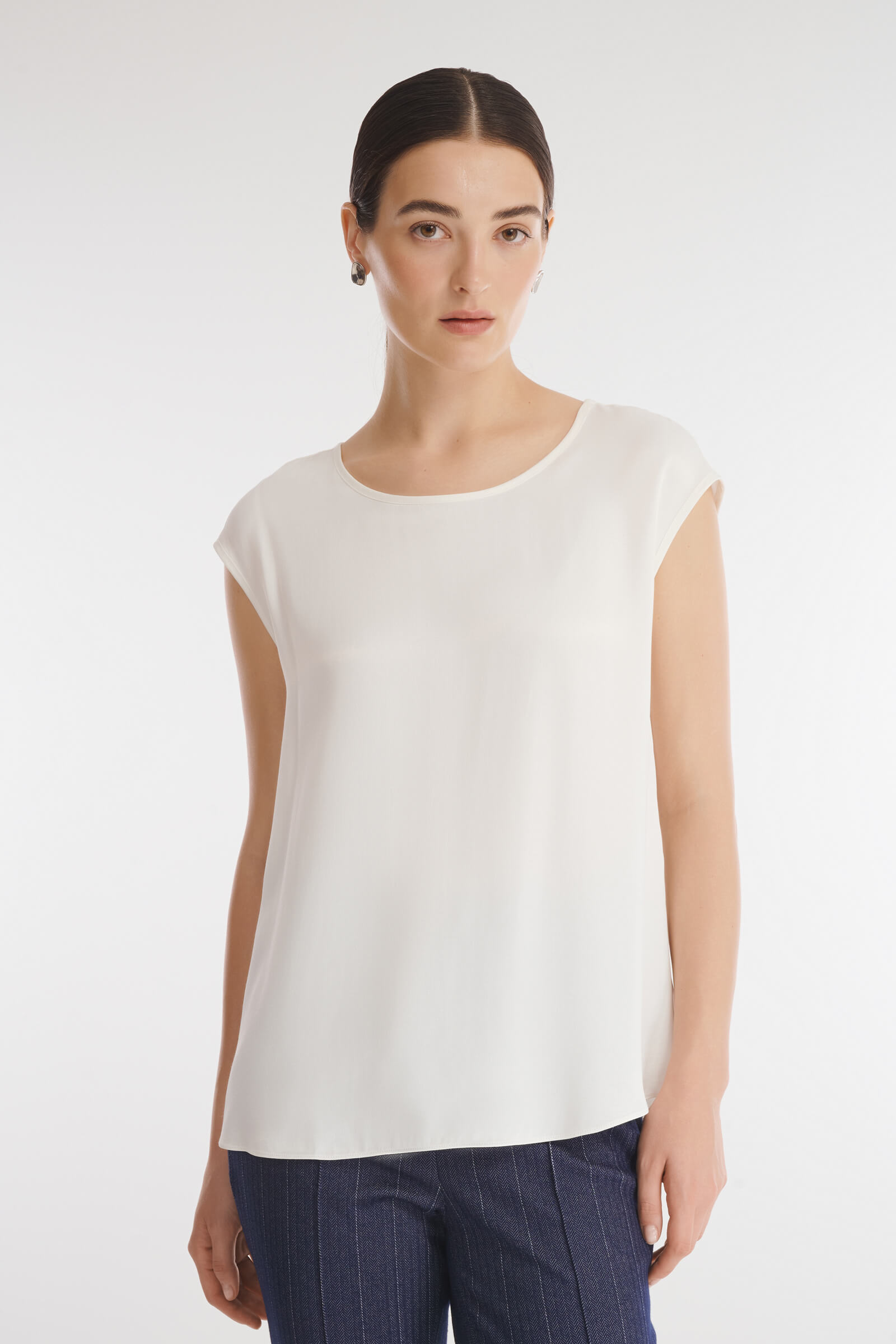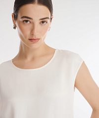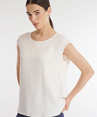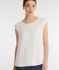 Топ с ультракоротким рукавом выполнен из 100% вискозы. Материал отлично пропускает воздух и не электризуется. Минималистичный дизайн делает топ универсальным дополнением любого гардероба.