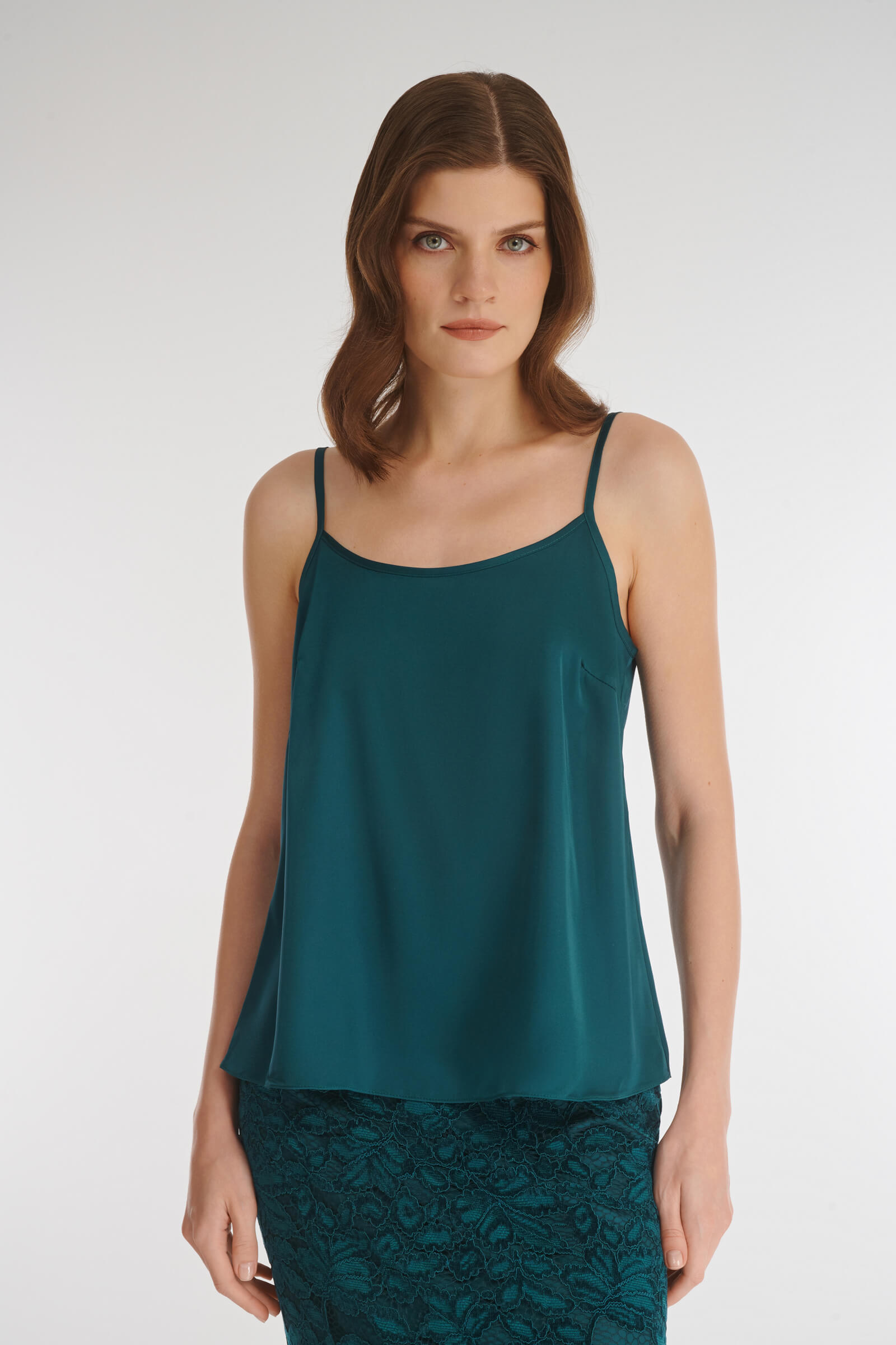 Минималистичный топ из гладкого смесового материала станет основой для создания различных образов: от повседневных до деловых и вечерних. Тонкие регулируемые бретели позволят подобрать индивидуальную посадку.