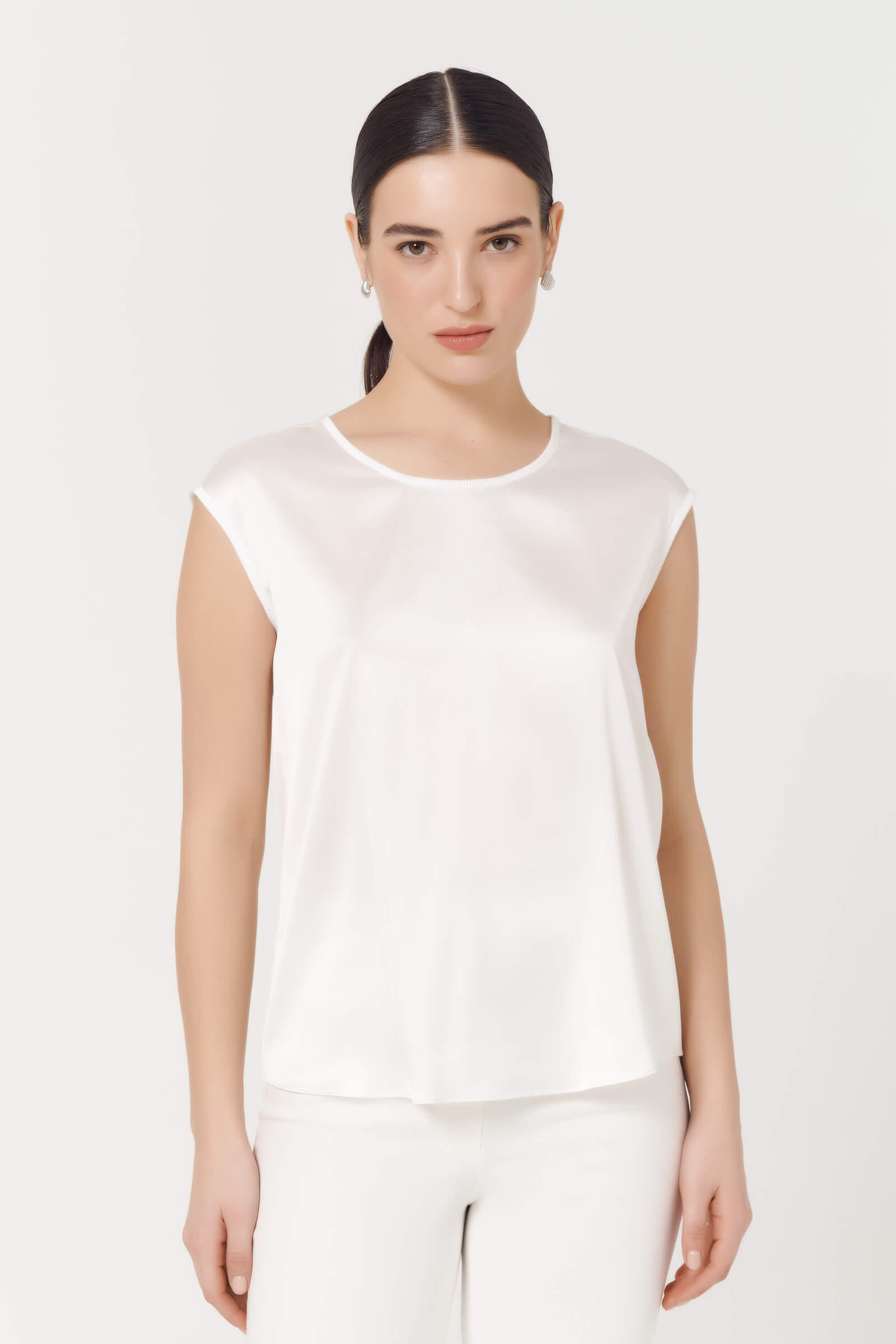 Элегантный топ со струящейся фактурой станет универсальной основой гардероба. Лаконичный дизайн уместен и в деловых, и в вечерних образах. Свободный крой позволяет носить изделие навыпуск или заправленным — в любом варианте образ выглядит стильно и современно