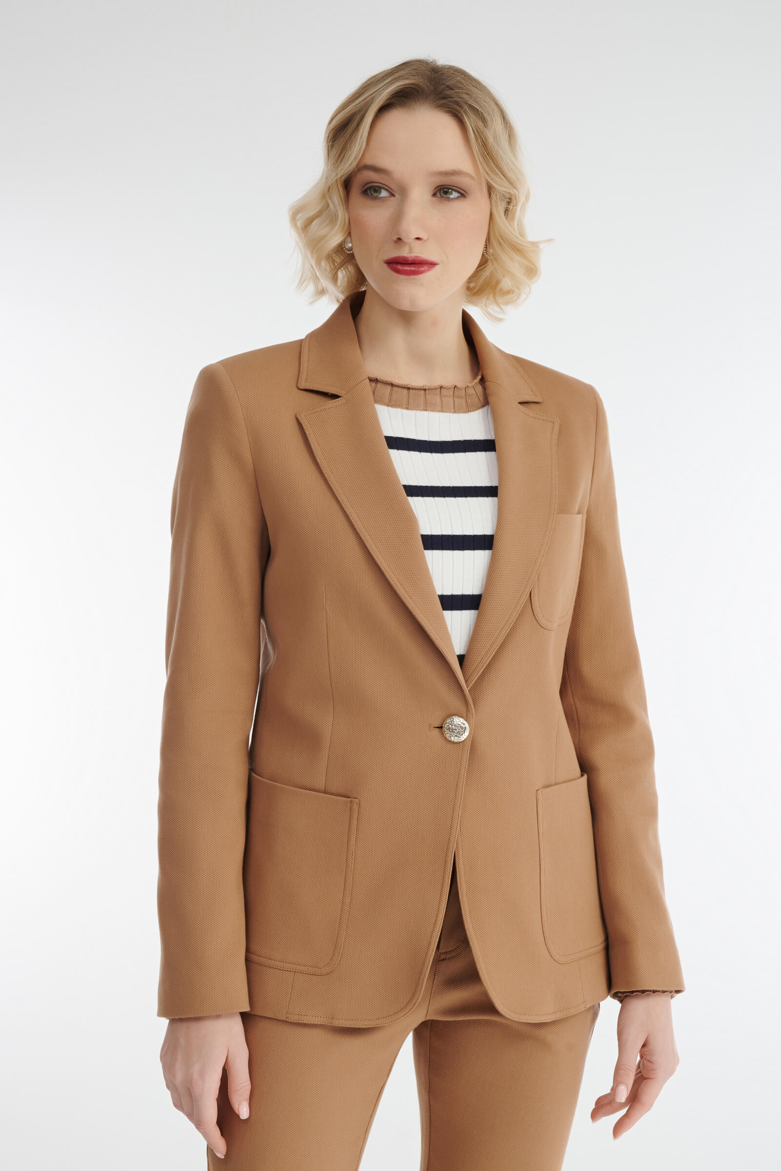 - Однобортный пиджак с застежкой на золотистую пуговицу