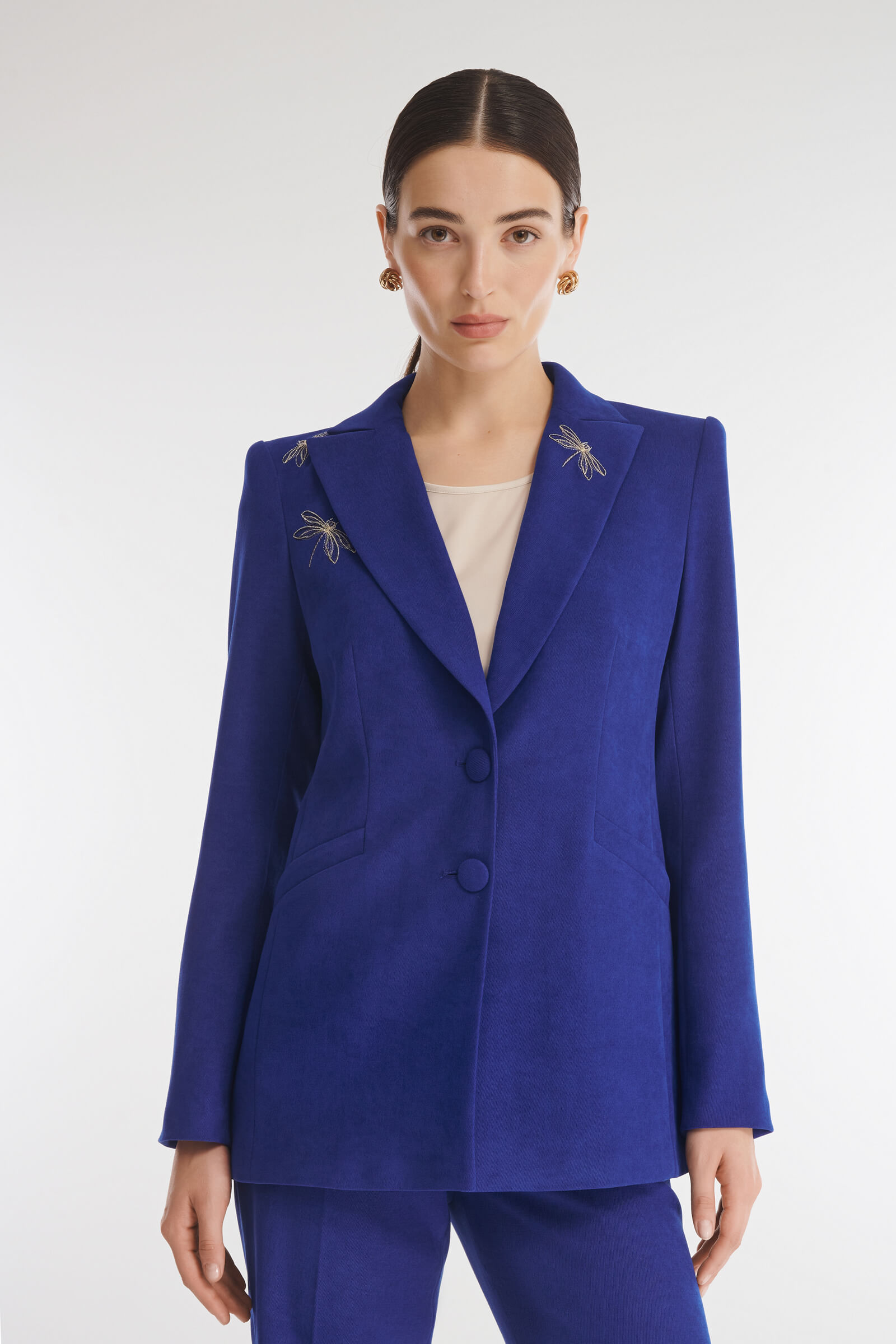 Однобортный пиджак выполнен из мягкого костюмного материала на основе вискозы. Минималистичная модель украшена утонченной вышивкой. Все детали и фурнитура выполнены точно в тон изделию, чтобы ничего не отвлекало на себя внимание. Стилизуйте пиджак с брюками из той же линейки для создания готового образа.