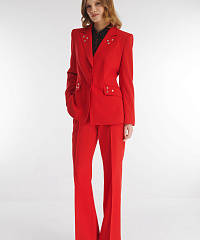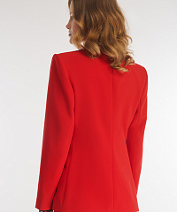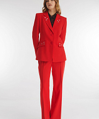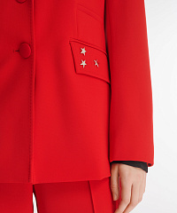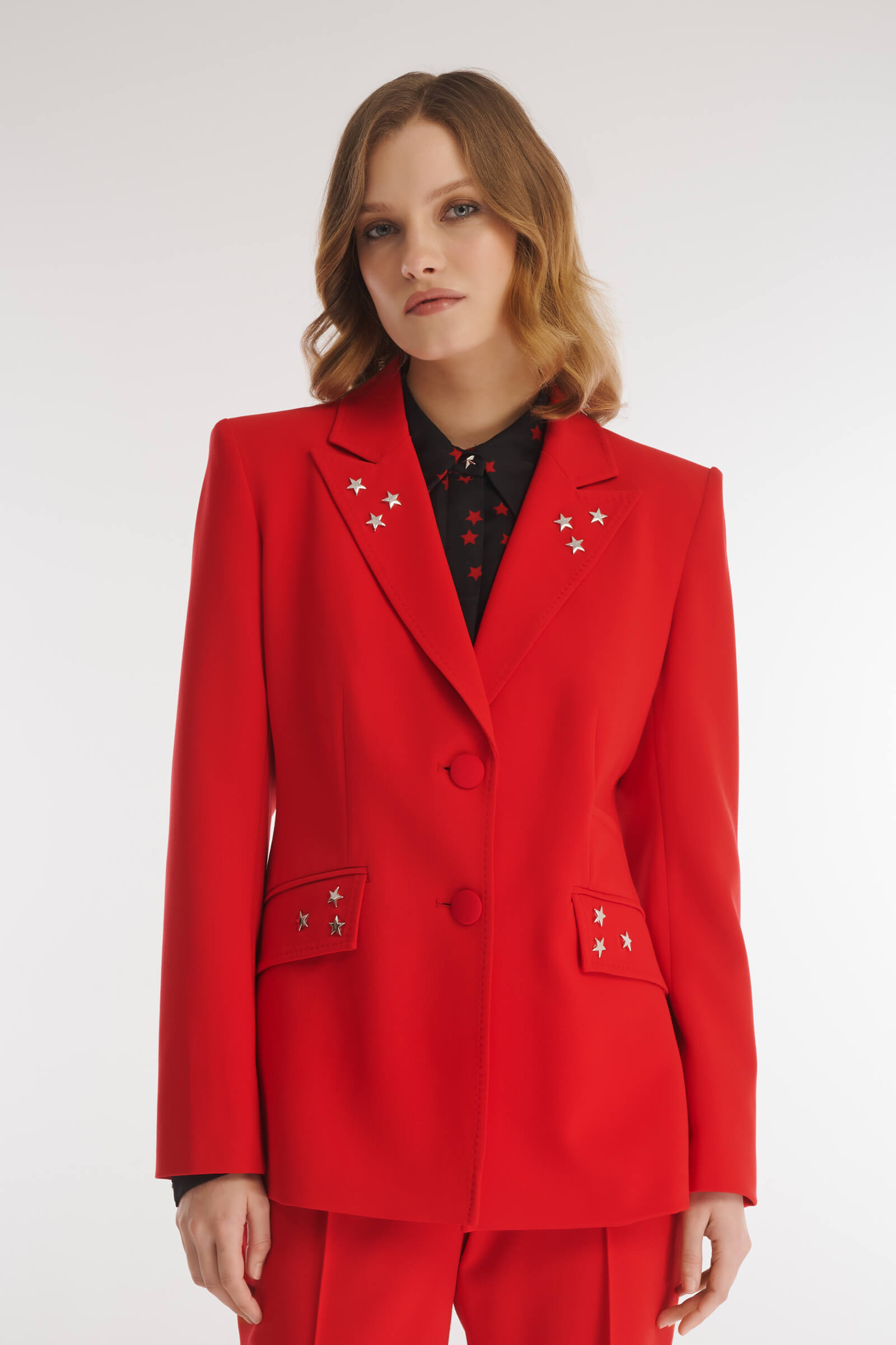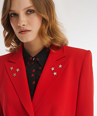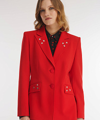 Для создания изделия был выбран плотный костюмный материал из смесовой вискозы. Классический дизайн разбавлен декором из небольших заклепок в форме звезд. Крой модели создает мягкий акцент на талии. Подплечники выделяют линию плеча и позволяют держать форму.