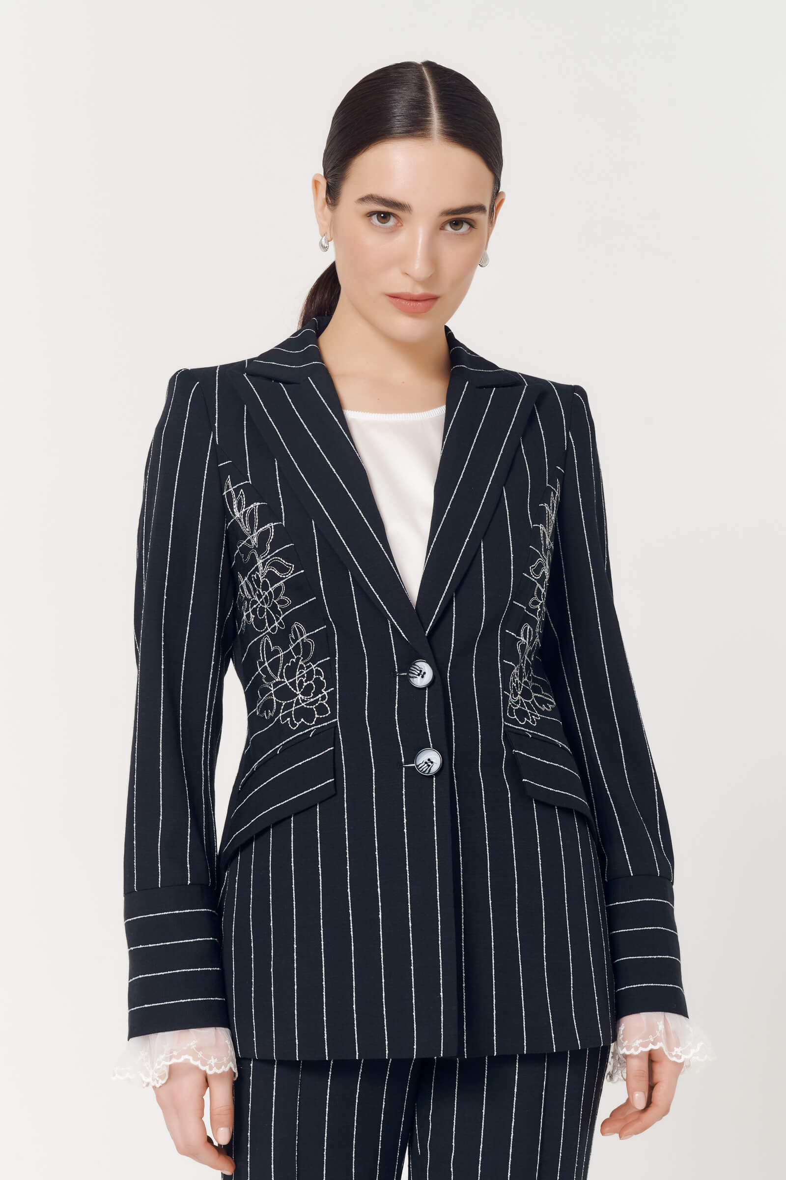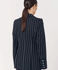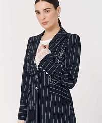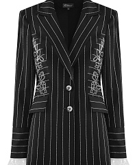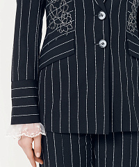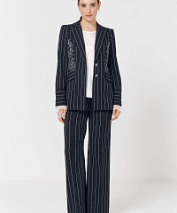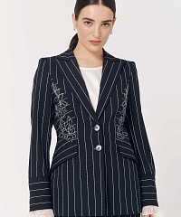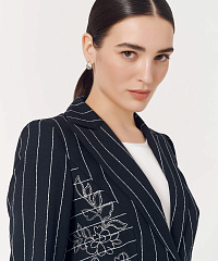 Пиджак в полоску выполнен с цветочной контрастной вышивкой. Благодаря приталенному крою модель выигрышно подчеркивает линию талии и создает элегантный и женственный образ. Дополнить тотал-лук можно с брюками из этой же линии.