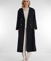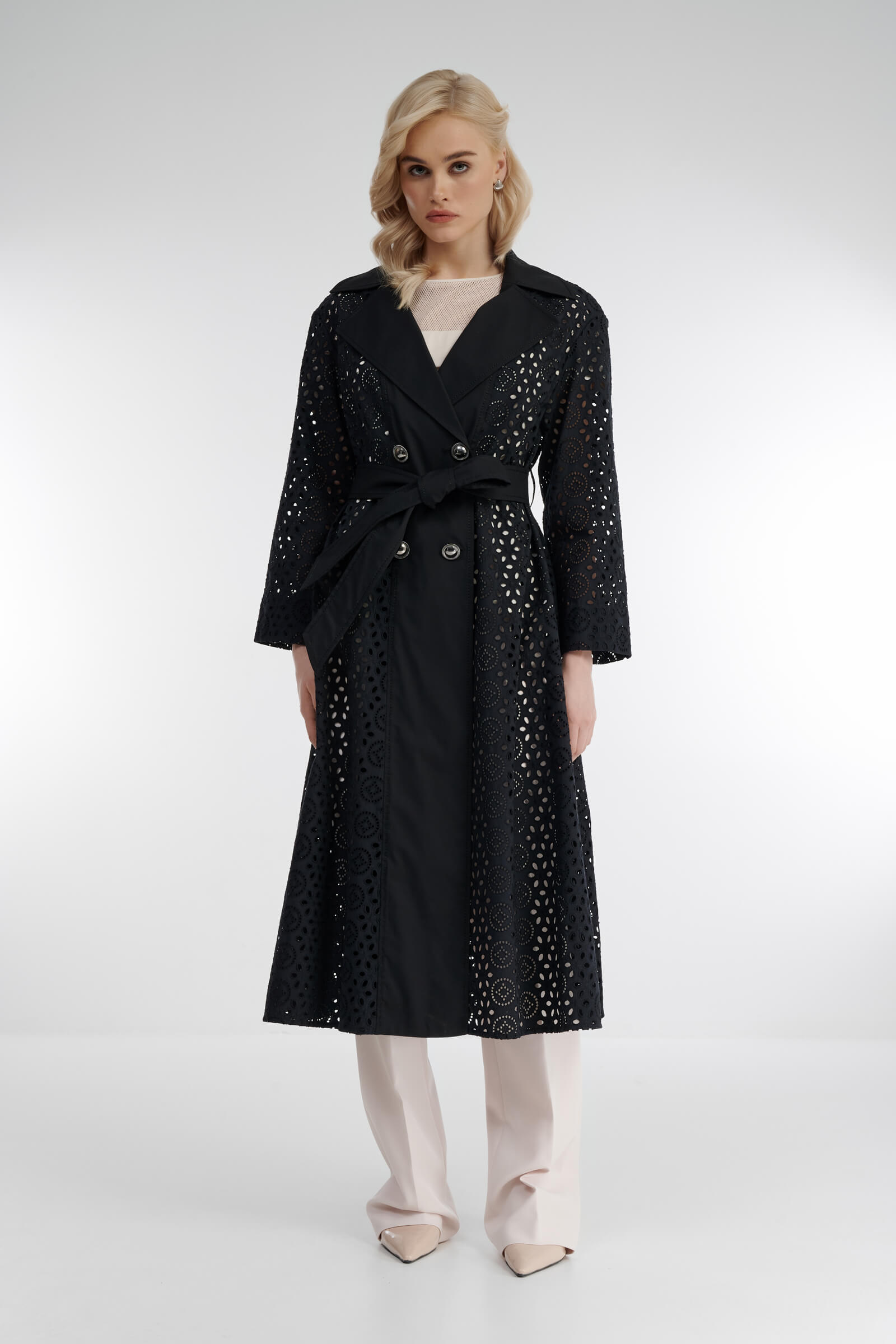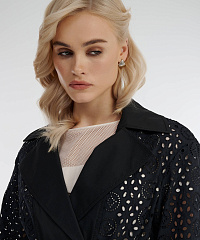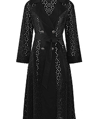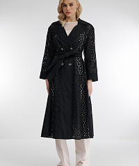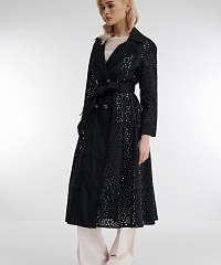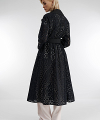 Легкий плащ свободного кроя из 100% хлопка украшен оригинальной перфорацией, что придает модели непередаваемый шарм. Модель без подкладки с длинным рукавом и отложным воротником потрясающе смотрится в контрасте с надетой под нее одеждой. Женственный силуэт поможет создать пояс, которым можно выделить талию.