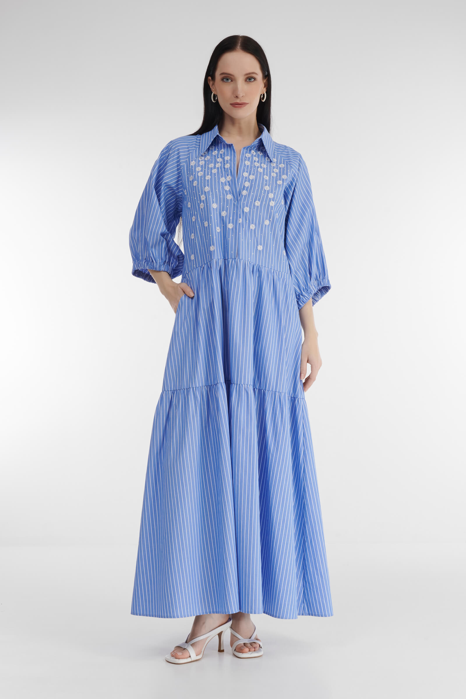 - Платье украшено цветочной вышивкой со стразами