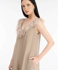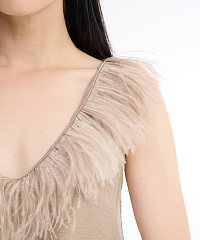 - Вырез декорирован перьями