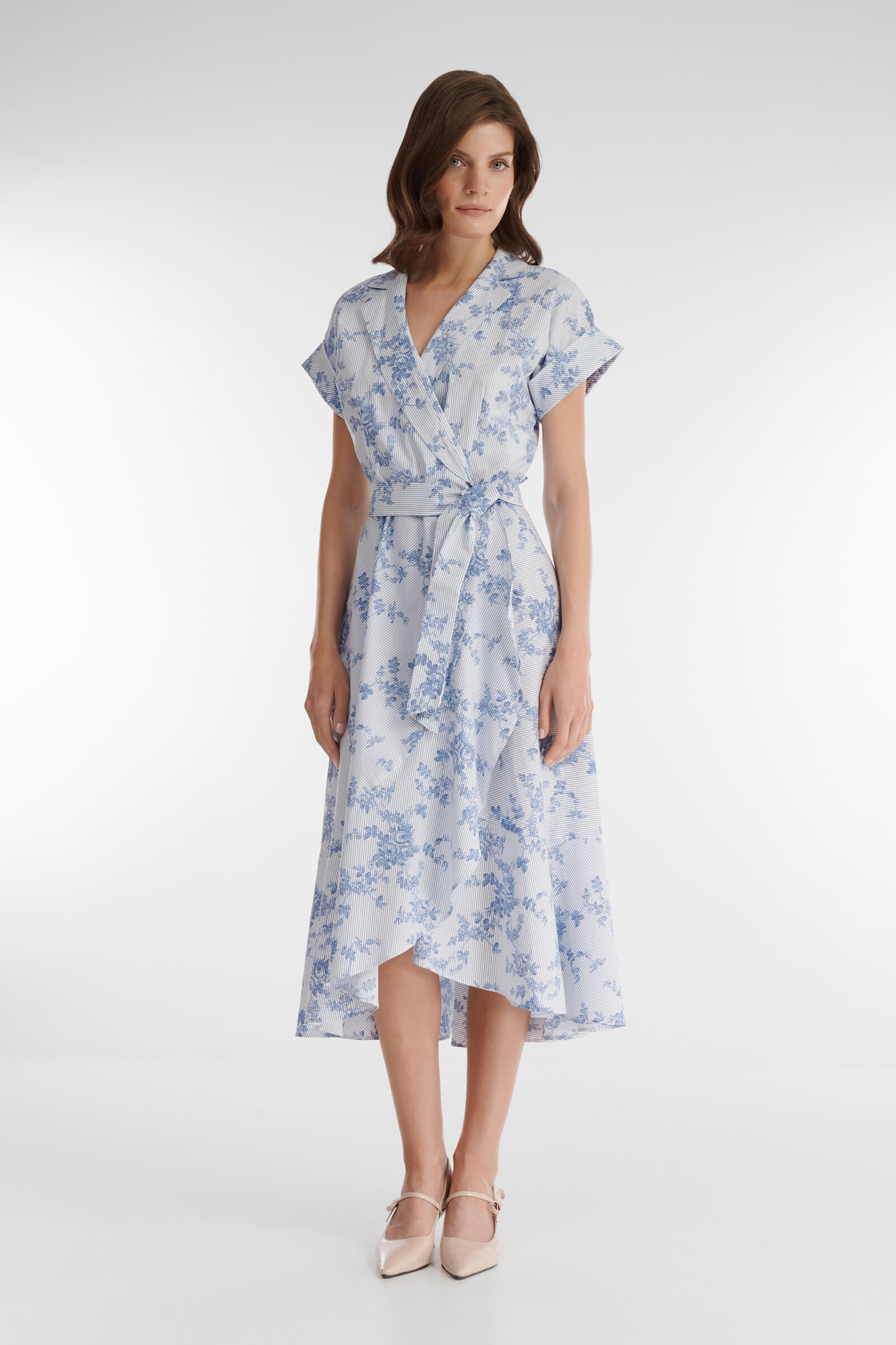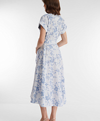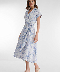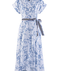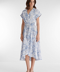 Платье-рубашка на запах идеально для создания стильных летних образов. Дышащий материал с преимущественным содержанием хлопка украшен комбинированным принтом с цветочным мотивом и узором в полоску. Крой изделия создает акцент на талии. Универсальная длина миди позволяет носить платье с обувью как на каблуке, так и на плоском ходу.