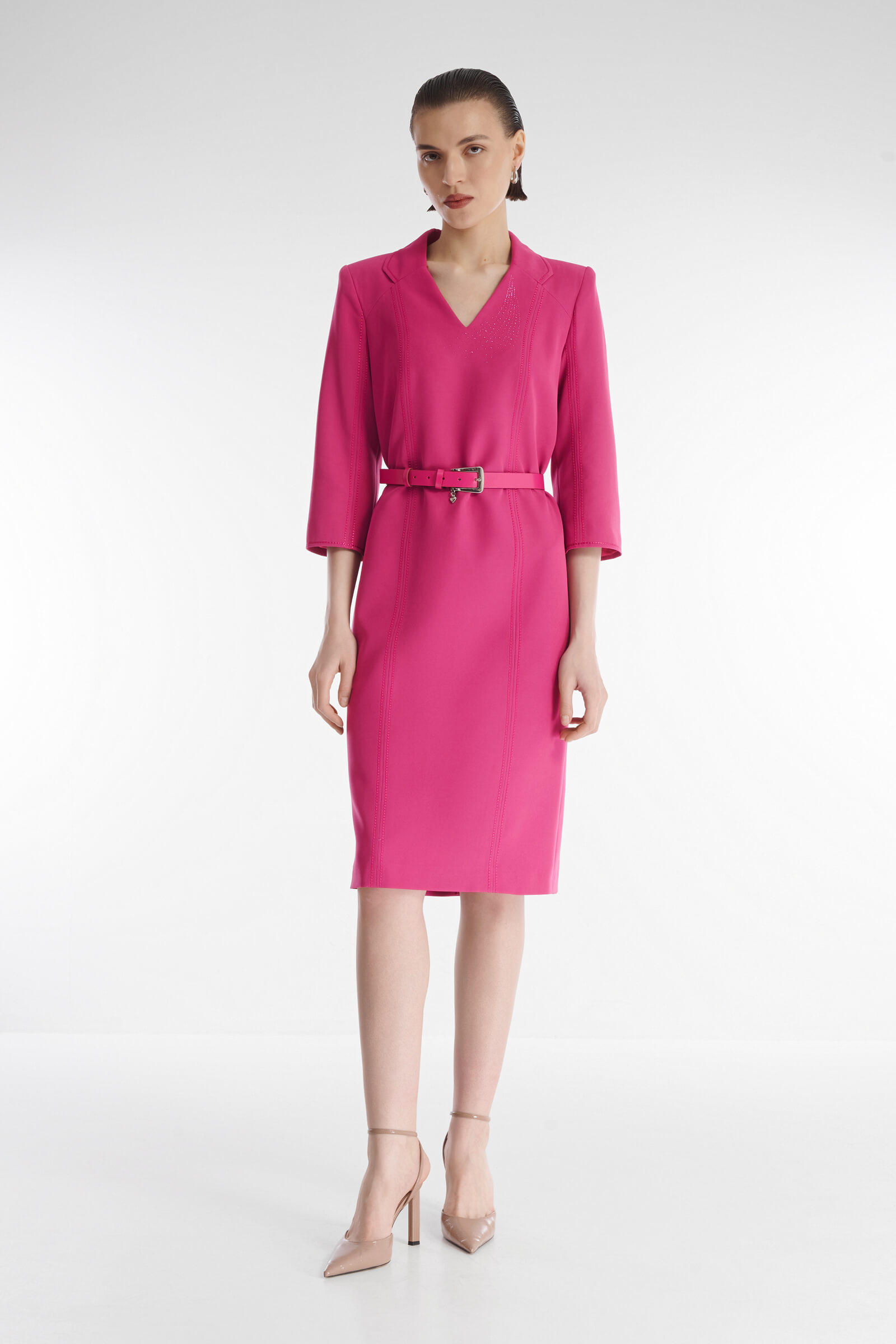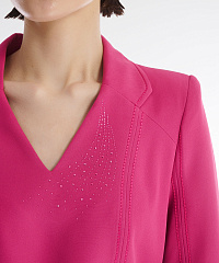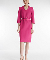 Платье классического фасона украшено россыпью страз и декоративной строчкой. Небольшие подплечники делают линию плеча более выразительной. Плотный материал на основе вискозы хорошо сохраняет форму. Платье выполнено в универсальной длине миди.