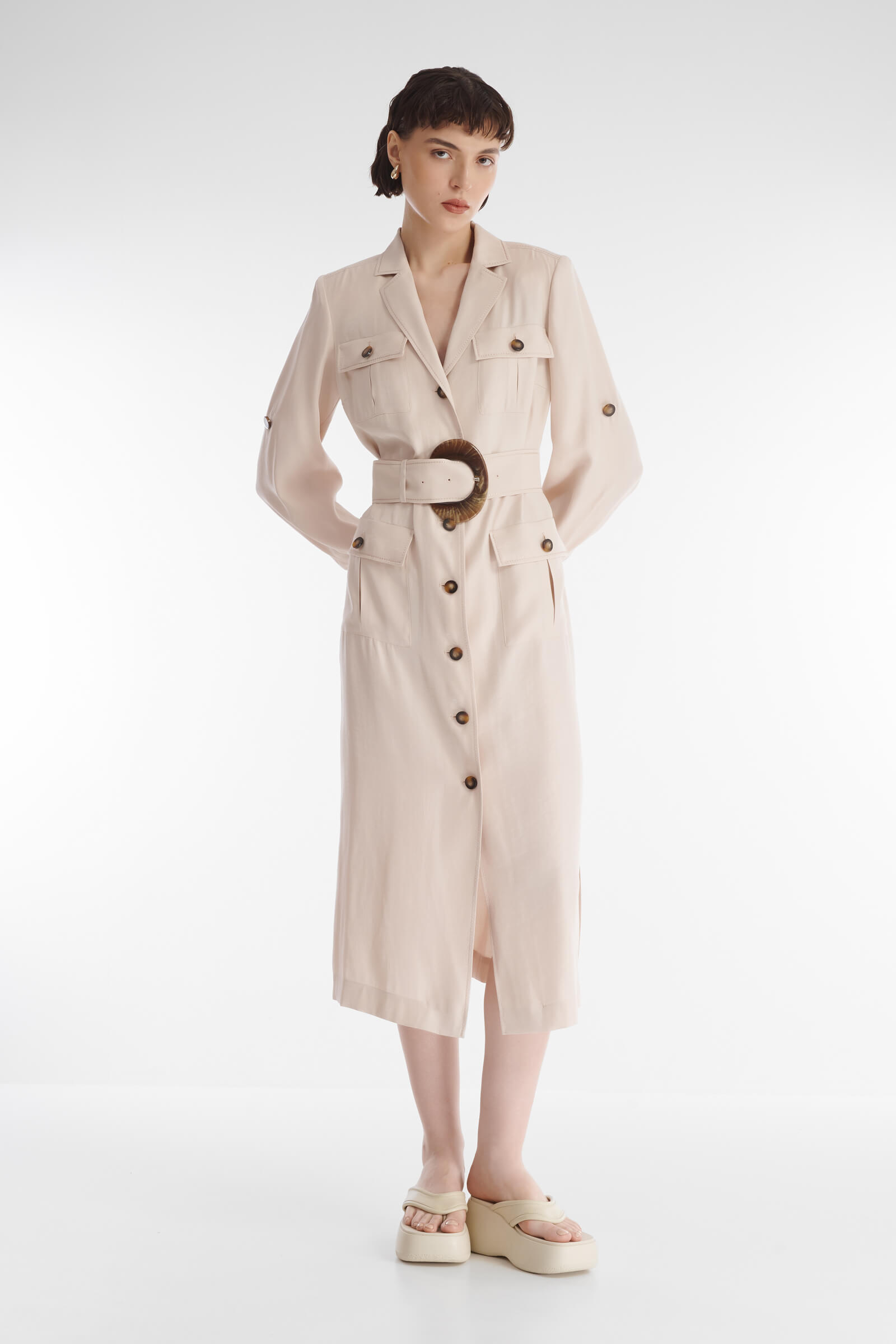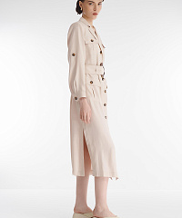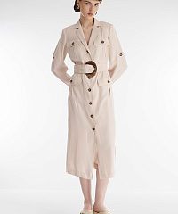Платье-рубашка в стиле сафари сочетает функциональность и актуальный дизайн. Накладные карманы на пуговицах, рукава с хлястиками, позволяющими регулировать длину, и удобные боковые разрезы. Мягкий материал на основе вискозы приятен для кожи, пропускает воздух и не требует особого ухода. Платье будет гармонично смотреться как с обувью на каблуке, так и на плоском ходу.
