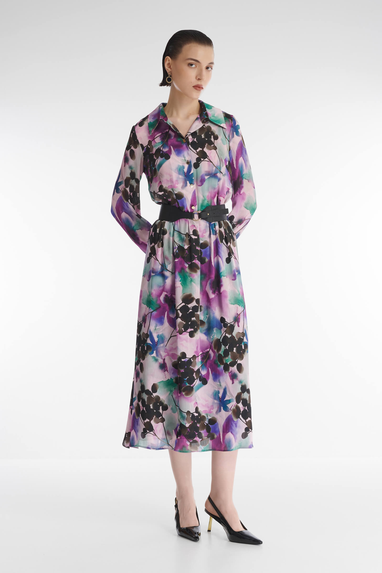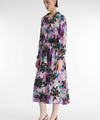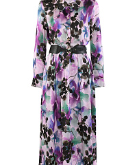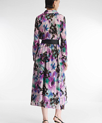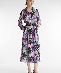 Платье-рубашка выполнено из смесового материала на основе вискозы. Ткань приятна для кожи и практически не мнется. Сложный принт с флористичными мотивами добавляет изделию динамики. Скрытая резинка создает акцент на талии, который можно дополнительно подчеркнуть при помощи ремня.