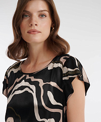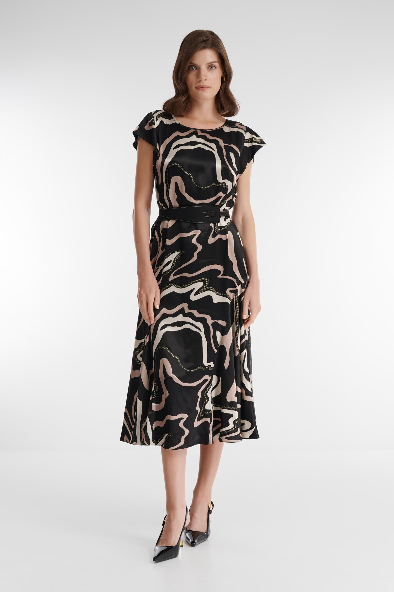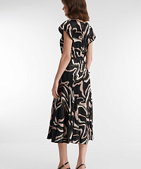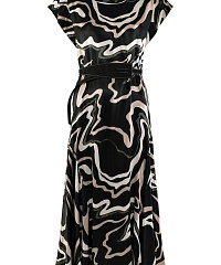 Для создания платья был выбран материал из 100% вискозы. Гладкая высококачественная ткань красиво струится во время носки и обладает функциональными преимуществами: отлично пропускает воздух и не электризуется. Абстрактный принт добавляет модели актуальности и динамики. Платье можно носить свободным или подчеркнув талию ремнем.