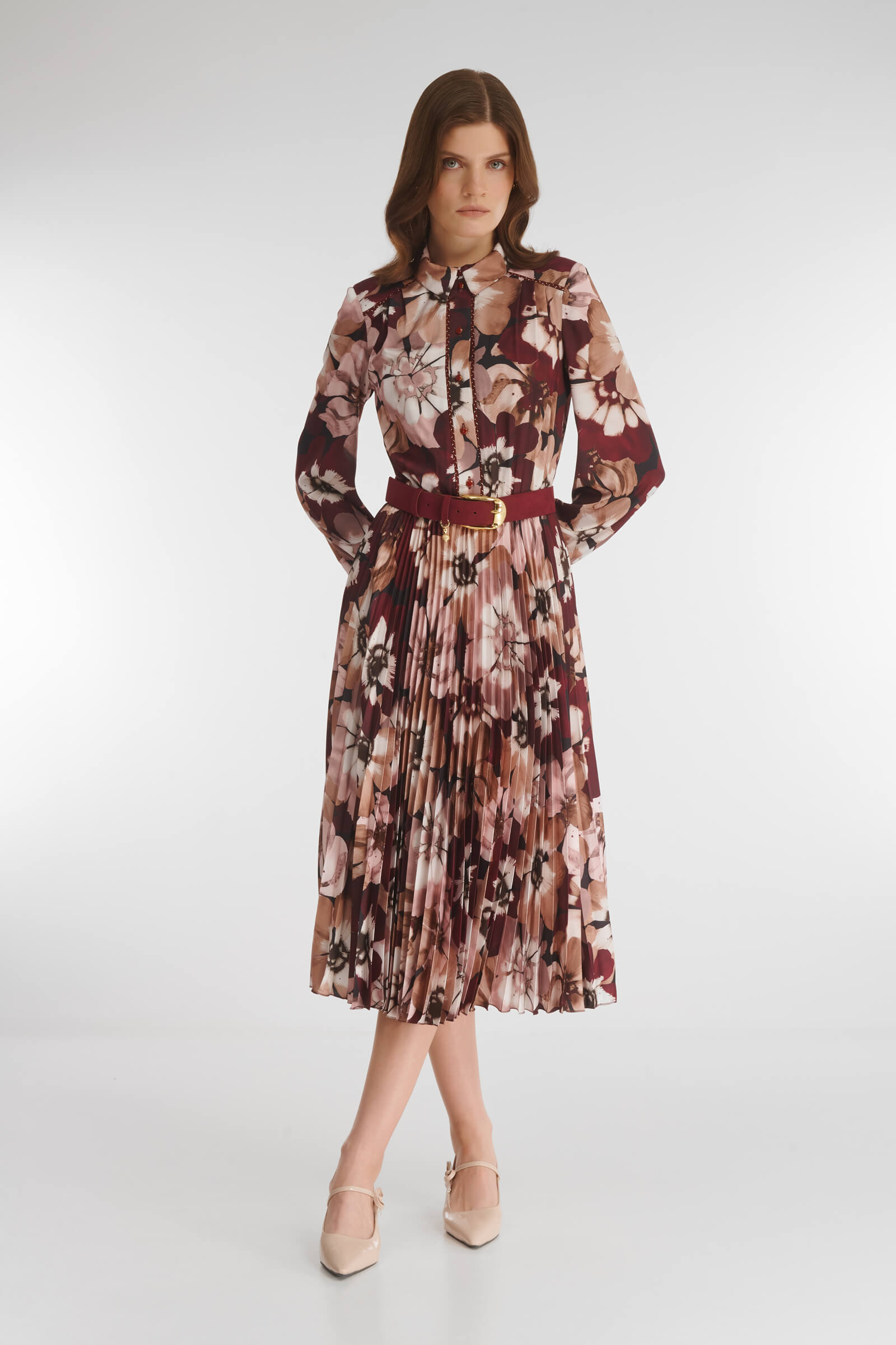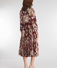 Платье-рубашка с цветочным принтом подойдет для создания элегантных и женственных образов. Фасон и длина модели позволяют стилизовать изделие с обувью как на каблуке, так и на плоском ходу. Материал на основе вискозы мягко струится, плиссировка добавляет силуэту динамики. Скрытая резинка на талии обеспечивает комфортную посадку для разных типов фигур.